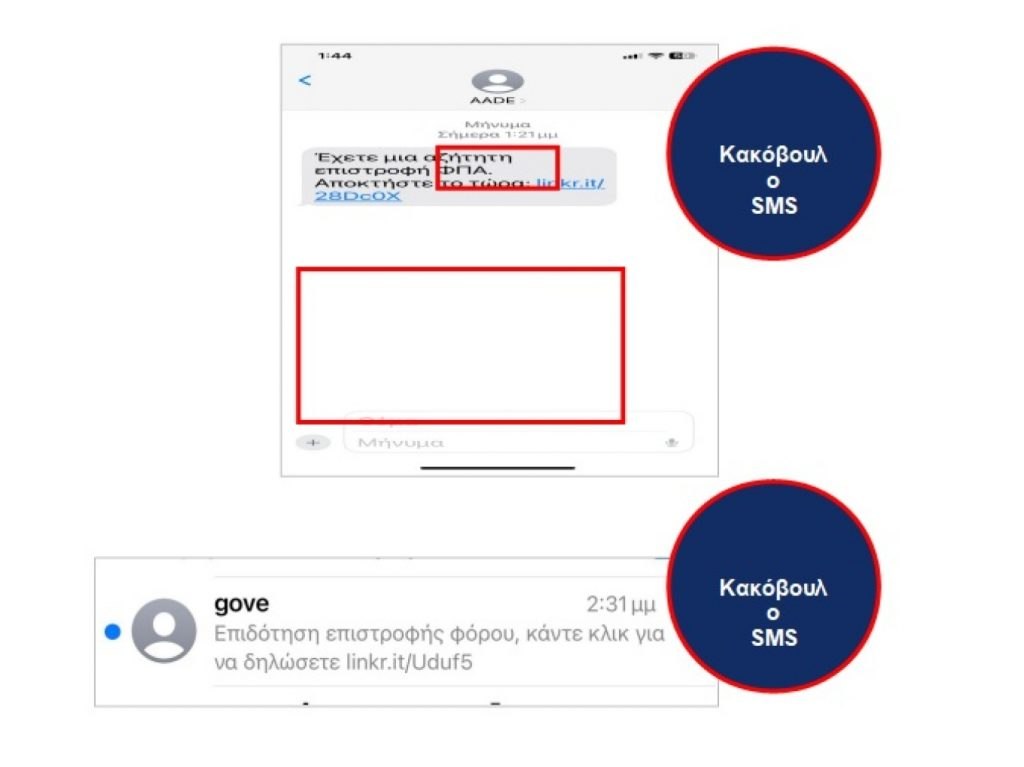 Με τη μέθοδο του «smishing» οι απατεώνες στέλνουν μηνύματα που φαίνεται πως αποστέλλονται από την ΑΑΔΕ και αξιόπιστες πηγές όπως το gov.gr και ισχυρίζονται πως ο παραλήπτης δικαιούται επιδότηση ή επιστροφή φόρου. Επίσης στα μηνύματα παροτρύνουν τους πολίτες να ανοίξουν το link για να μπουν σε πλαστή ιστοσελίδα.