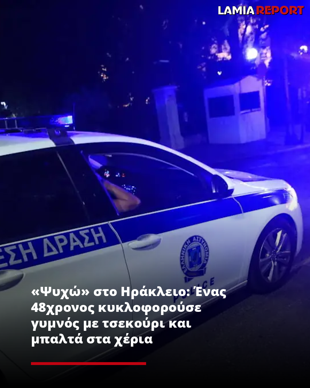 Ένας 48χρονος Αλβανός, οικοδόμος στο επάγγελμα, εθεάθη, γύρω στις 2:30 να περιδιαβαίνει... γυμνόw τις λεωφόρους Εθνικής Αντιστάσεως και Ικάρου, κρατώντας στα χέρια ένα τσεκούρι κι έναν μπαλτά! Μάλιστα, όπως διαπιστώθηκε, στα χέρια του είχε και αίμα, καθώς είχε αυτοτραυματιστεί.