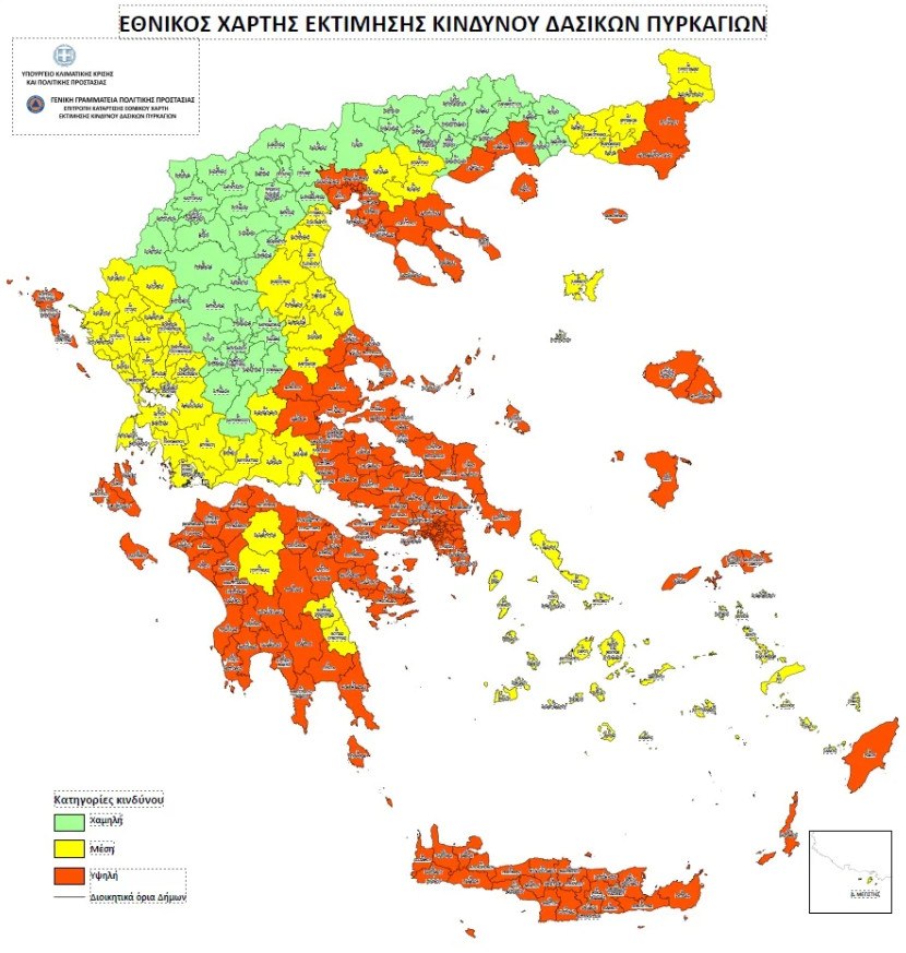 Με τον νέο Χάρτη, οι Δήμοι της χώρας κατατάσσονται σε 3 κατηγορίες: χαμηλής, μεσαίας και υψηλής επικινδυνότητας, ανάλογα με το είδος της βλάστησης, τις κλιματολογικές συνθήκες και τη συχνότητα τιμών 3, 4 και 5 στον ημερήσιο Χάρτη Πρόβλεψης Κινδύνου Πυρκαγιάς της Γενικής Γραμματείας Πολιτικής Προστασίας τα τελευταία 20 έτη.