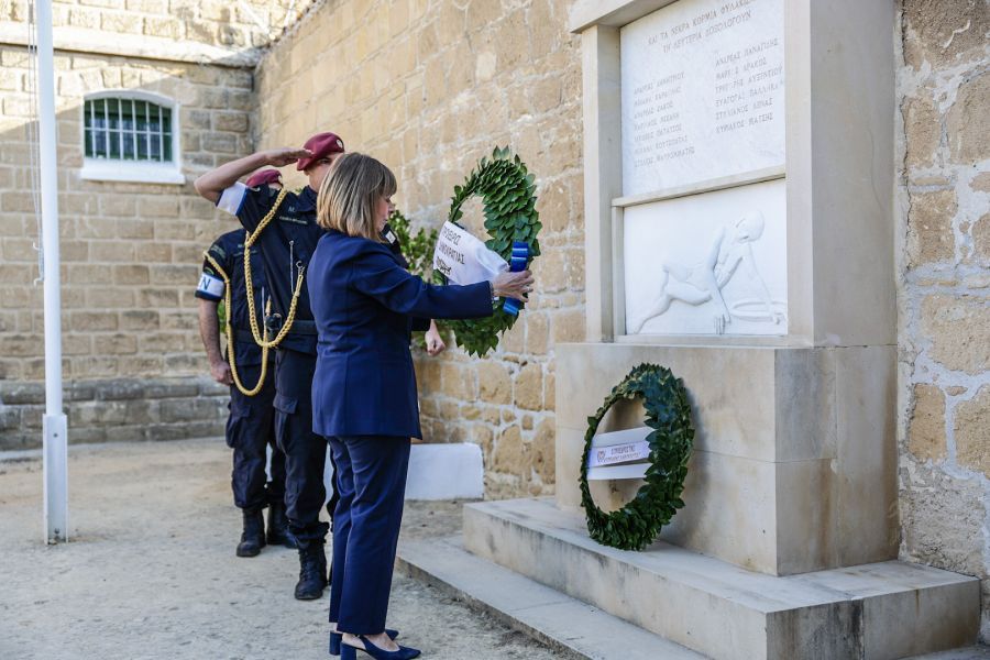 Νωρίτερα, η κυρία Σακελλαροπούλου παρέστη στο τρισάγιο που τελέστηκε στα Φυλακισμένα Μνήματα και κατέθεσε στεφάνι. Στεφάνι επίσης κατέθεσε στον ανδριάντα του Αρχιεπισκόπου Μακαρίου Γ’, καθώς και στο Μνημείο Δημοκρατίας και Αντίστασης.