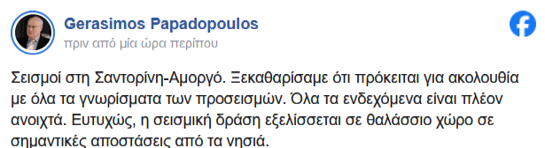 Η ανάρτηση έχει ως εξής: «Σεισμοί στη Σαντορίνη-Αμοργό. Ξεκαθαρίσαμε ότι πρόκειται για ακολουθία με όλα τα γνωρίσματα των προσεισμών. Όλα τα ενδεχόμενα είναι πλέον ανοιχτά. Ευτυχώς, η σεισμική δράση εξελίσσεται σε θαλάσσιο χώρο σε σημαντικές αποστάσεις από τα νησιά».