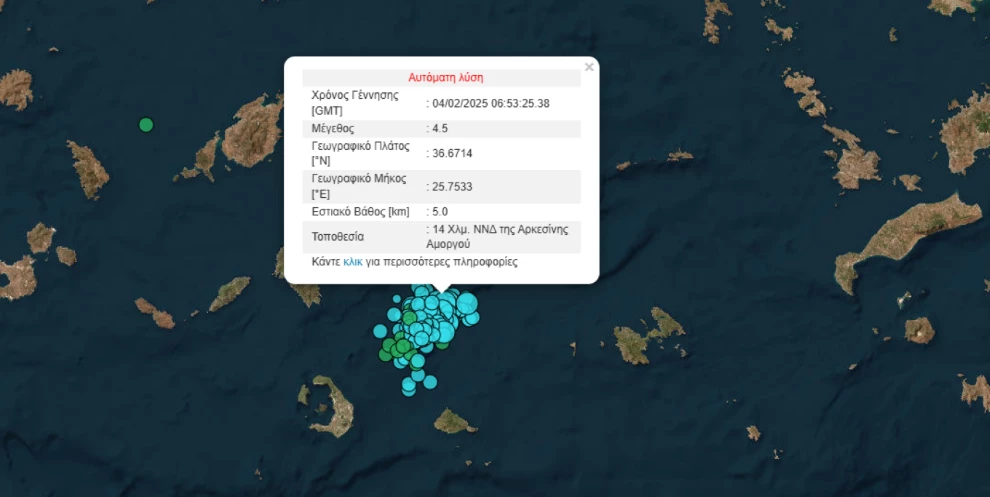 Σύμφωνα με την αυτόματη λύση του Γεωδυναμικού Ινστιτούτου ο πρώτος σεισμός είχε επίκεντρο 18 χλμ. νότια της Αμοργού, ενώ στις 8:53 σημειώθηκε νέα δόνηση στην περιοχή, που ήταν μεγέθους 4,5 Ρίχτερ.