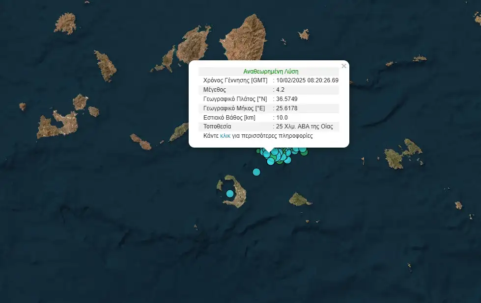 Σύμφωνα με το Γεωδυναμικό Ινστιτούτο ο νέος σεισμός σημειώθηκε στις 10:20 με εστιακό βάθος τα 10 χλμ και επίκεντρο 25 χλμ βορειοανατολικά της Σαντορίνης.
