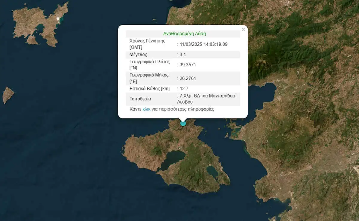 Σεισμός μεγέθους 3,1 βαθμών της κλίμακας Ρίχτερ σημειώθηκε στη Λέσβο το απόγευμα της Τρίτης (11.03.2025).