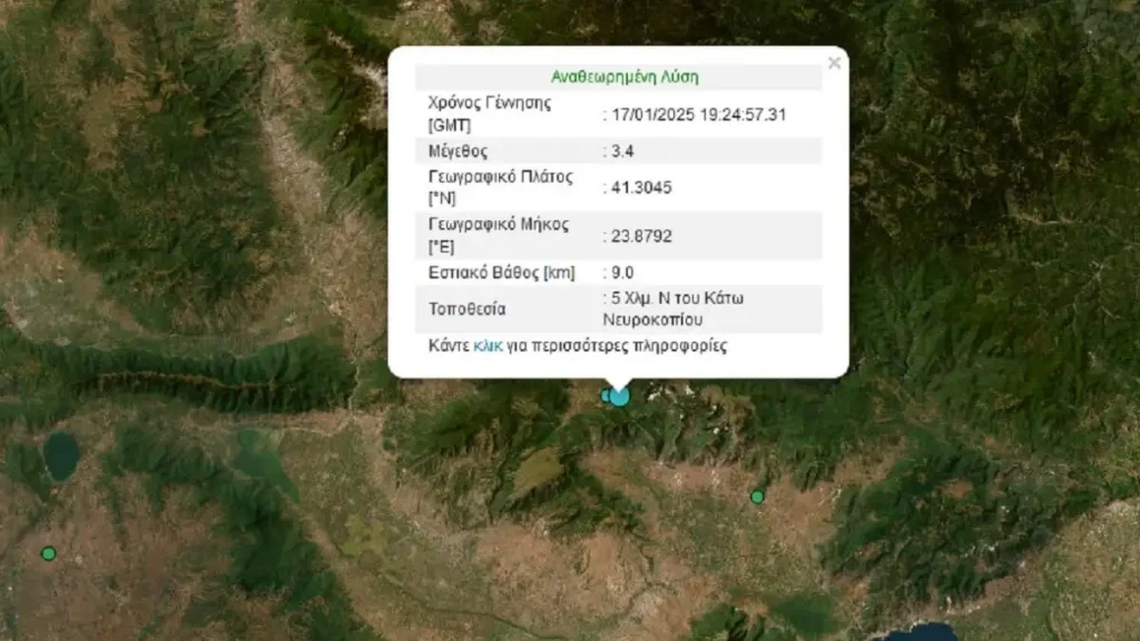 Σεισμός 3,4 Ρίχτερ σημειώθηκε το βράδυ της Παρασκευής (17/01/2024) στο Νευροκόπι της Δράμας σε χαμηλό εστιακό βάθος.