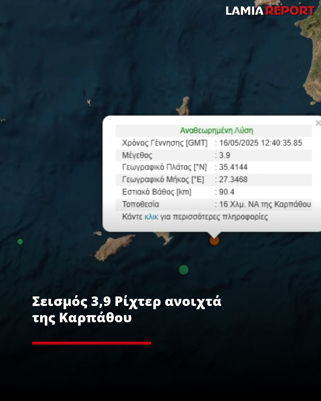 Σύμφωνα με το Γεωδυναμικό Ινστιτούτο Αθηνών ο σεισμός σημειώθηκε 16 Χλμ. ΝΑ της Καρπάθου, ενώ το εστιακό του βάθος ήταν στα 90.4 χλμ.