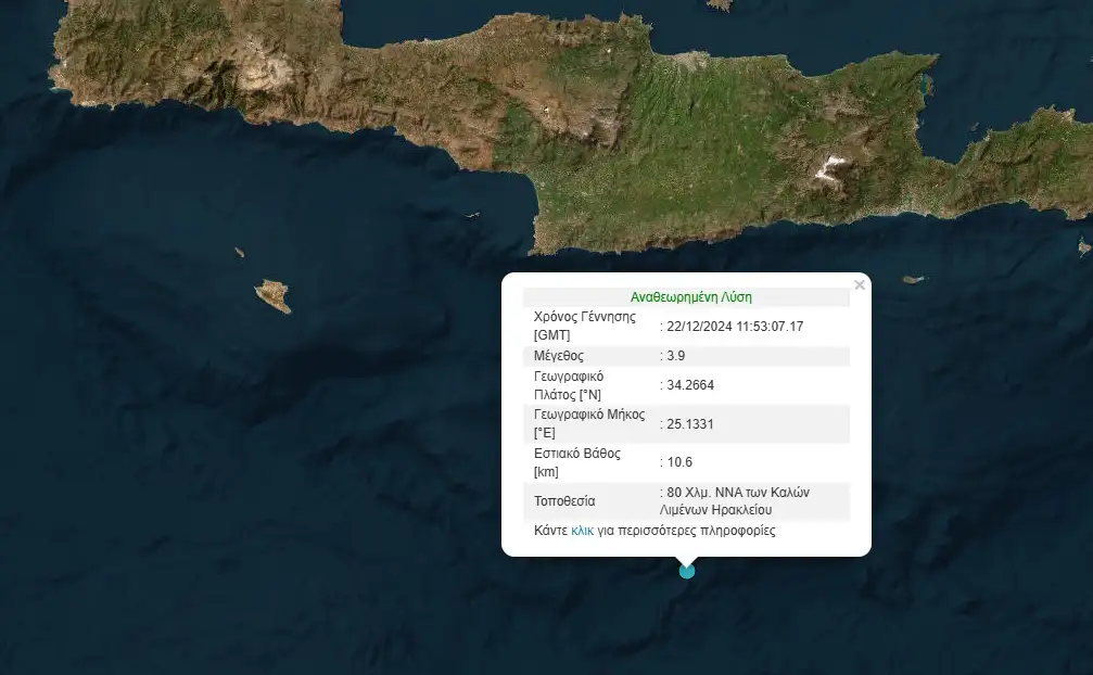 Σεισμός 3,9 Ρίχτερ σημειώθηκε ανοιχτά της Κρήτης και συγκεκριμένα στην περιοχή νοτιοανατολικά των Καλών Λιμένων Ηρακλείου.