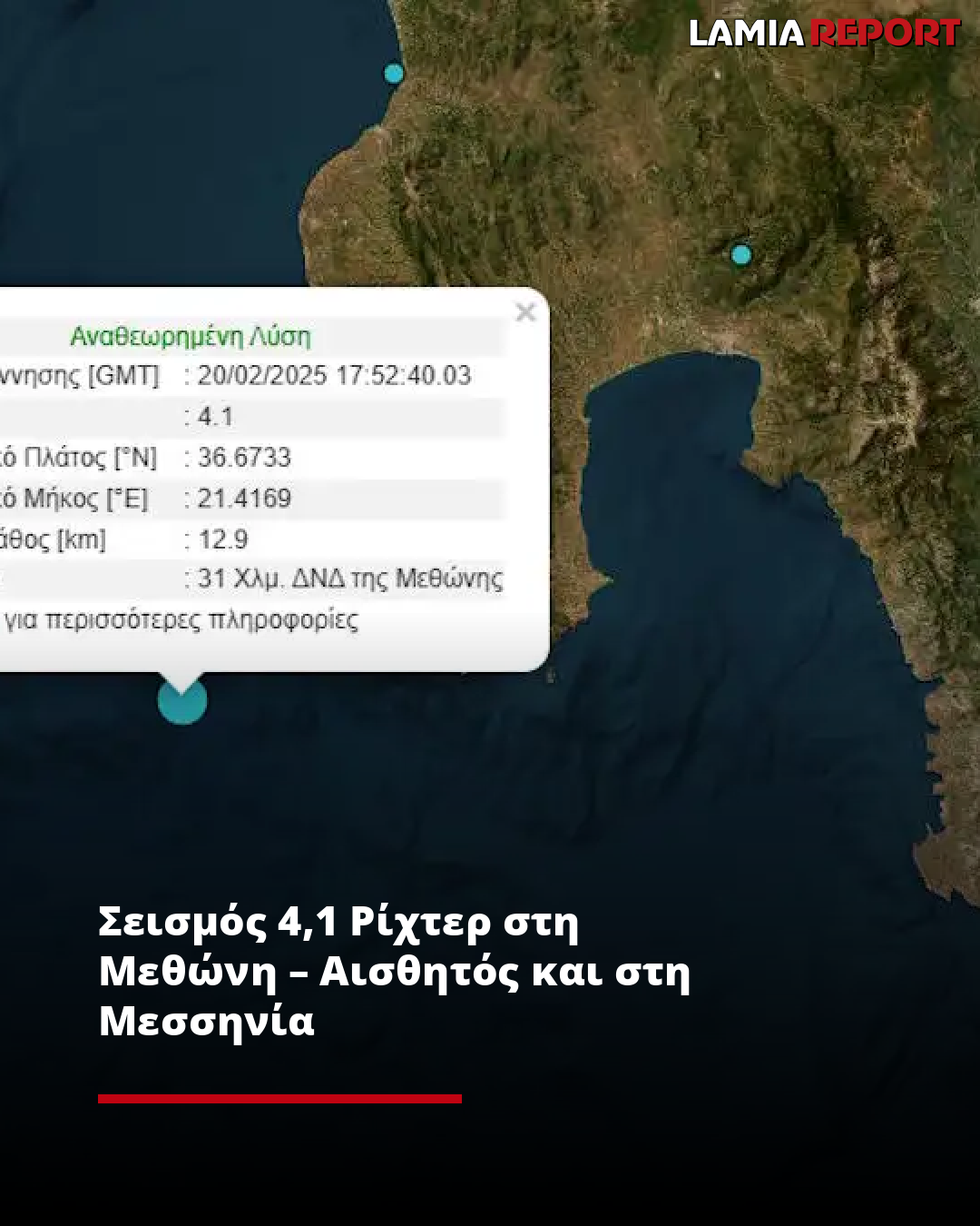 Σεισμός μεγέθους 4,1 της κλίμακας Ρίχτερ σημειώθηκε στη Μεθώνη την Πέμπτη (20.02.2025).