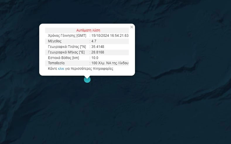 Ειδικότερα, σύμφωνα με το Γεωδυναμικό Ινστιτούτο, ο σεισμός ήταν μεγέθους 4,7 Ρίχτερ και το επίκεντρό του εντοπίζεται 100 χιλιόμετρα νοτιοανατολικά της Λίνδου.