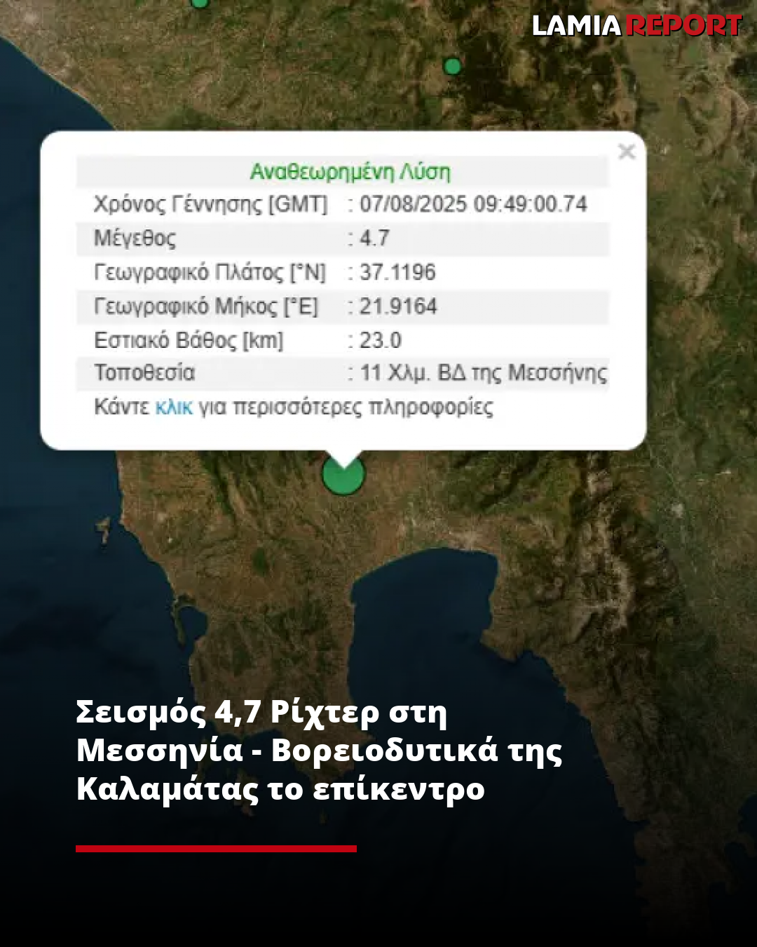 Σύμφωνα με την αυτόματη λύση του Γεωδυναμικού Ινστιτούτου το επίκεντρο του σεισμού που σημειώθηκε στις 12:49, εντοπίστηκε 11 χλμ. βορειοδυτικά της Μεσσήνης.