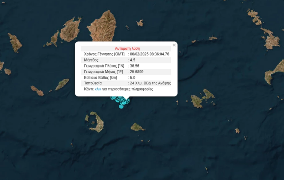 Σεισμός σημειώθηκε ανοιχτά της Ανάφης το πρωί του Σαββάτου (8/2/2025) και το χτύπημα του εγκέλαδου ήταν 4,5 Ρίχτερ.
