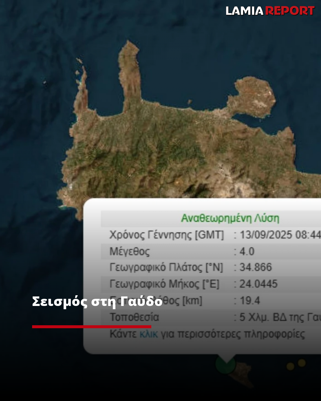 Ο σεισμός είχε επίκεντρο θαλάσσια περιοχή 5 χιλιόμετρα βορειοδυτικά της Γαύδου, σε απόσταση περίπου 347 χιλιομέτρων νότια της Αθήνας.