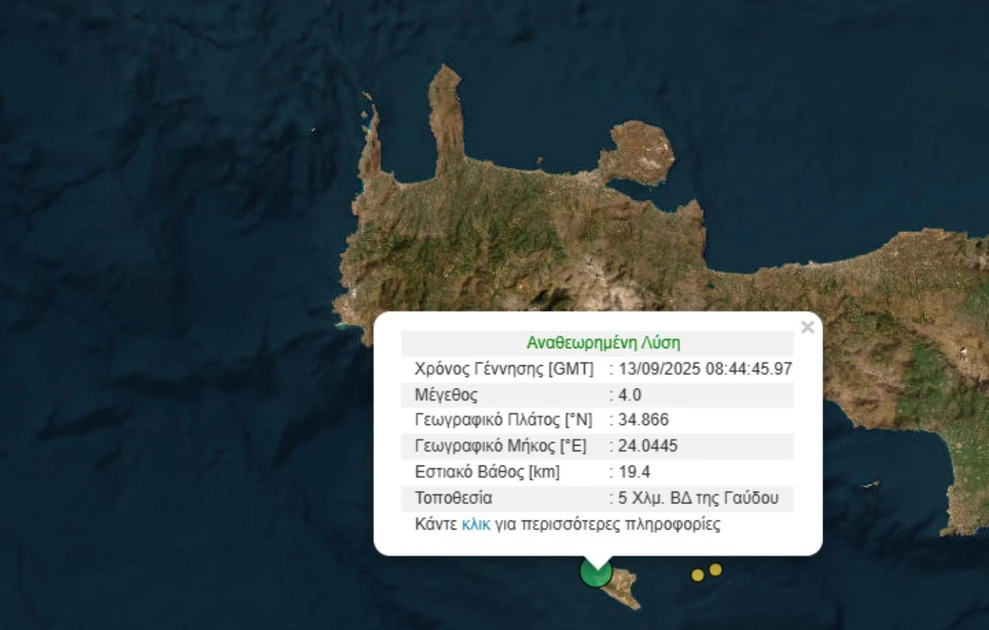 Σεισμική δόνηση μεγέθους 4 βαθμών της κλίμακας Ρίχτερ σημειώθηκε το πρωί του Σαββάτου 13 Σεπτεμβρίου στη Γαύδο, σύμφωνα με ανακοίνωση του Γεωδυναμικού Ινστιτούτου του Εθνικού Αστεροσκοπείου Αθηνών.