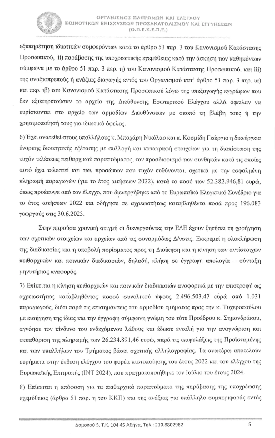 Παράλληλα, ο κ. Σαλάτας αναφέρει στο ίδιο έγγραφο πως έχει ζητήσει ένορκη διοικητική εξέταση «σχετικά με τη εσφαλμένη πληρωμή παραγωγών (για το έτος αιτήσεων 2022) και το ποσό των 52.382.946,81 ευρώ, όπως προέκυψε από τον έλεγχο, που διενεργήθηκε από το Ευρωπαϊκό ελεγκτικό Συνέδριο για το έτος αιτήσεων 2022 και οδήγησε σε αχρεωστήτως καταβληθέντα ποσά προς 196.083 γεωργούς στις 30.6.2023” ενώ σε άλλο σημείο τονίζει «επίκειται η κίνηση πειθαρχικών και ποινικών διαδικασιών αναφορικά με την επιστροφή ως αχρεωστήτως καταβληθέντος ποσού συνολικού ύψους 2.496.503,47 ευρώ από 1.031 παραγωγούς διότι παρά τις επισημάνσεις του αρμόδιου τμήματος προς την κυρία Τυχεροπούλου με εισήγηση της ίδιας και την έγγραφη σύμφωνη γνώμη του τότε προέδρου κ. Σημανδράκου αγνόησε τον κίνδυνο του ενδεχόμενου λάθους και έσωσε εντολή για την αναγνώριση και εκκαθάριση της πληρωμής 26.234.891,46 ευρώ, παρά τις επιφυλάξεις της Προϊσταμένης και των υπαλλήλων του τμήματος βάσει σχετικής αλληλογραφίας…. Η Υπηρεσία Εσωτερικών Υποθέσεων σωμάτων Ασφαλείας - Τμήμα Ειδικών Υποθέσεων της ΕΛΑΣ διενεργεί προκαταρκτική εξέταση μετά από παραγγελία της Εισαγγελίας Πρωτοδικών Αθηνών, σχετικά με την εμπλοκή της κ. Παρασκευής Τυχεροπούλου όσον αφορά στην χορήγηση ενισχύσεων περίπου 120.000 ευρώ σε συγκεκριμένο αιτούντα για τα έτη 2022 και 2023. Έχουν ήδη αποσταλεί στην εν λόγω υπηρεσία, αποδεικτικά στοιχεία σχετικά με την εμπλοκή της κ. Τυχεροπούλου στην συγκεκριμένη υπόθεση».