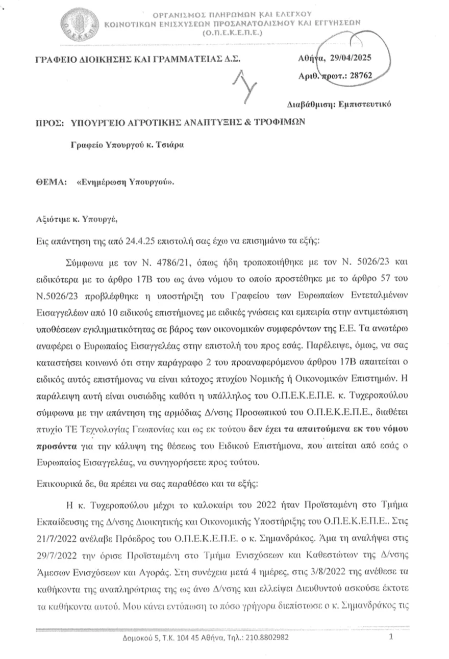 Συγκεκριμένα, ο κ. Σαλάτας σε εμπιστευτικό απαντητικό έγγραφο που απέστειλε στον Υπουργό Αγροτικής Ανάπτυξης και Τροφίμων Κώστα Τσιάρα στις 29.4.2025 καταγράφει τους λόγους για τους οποίους η κυρία Τυχεροπούλου όχι μόνο δεν έπρεπε να αποσπασθεί στην Ευρωπαϊκή Εισαγγελία προκειμένου να συνδράμει στις έρευνες, αλλά έπρεπε να καταστεί η ίδια ελεγχόμενη για σωρεία παραβάσεων. Είχε προηγηθεί έγγραφη επιστολή του κ. Τσιάρα (25.4.2025) με την οποία ενημέρωνε τον πρόεδρο του ΟΠΕΚΕΠΕ για το σχετικό αίτημα της Ευρωπαϊκής Εισαγγελίας και τον καλούσε να εξετάσει «εάν συντρέχουν οι τυπικές προϋποθέσεις για την απόσπαση» της κυρίας Τυχεροπούλου επισημαίνοντας πως «την υποχρέωση που έχουμε έναντι της Ευρωπαϊκής Εισαγγελίας, να συνδράμουμε με τον καλύτερο δυνατό τρόπο στις έρευνες τους, ανταποκρινόμενοι στο αίτημα τους».