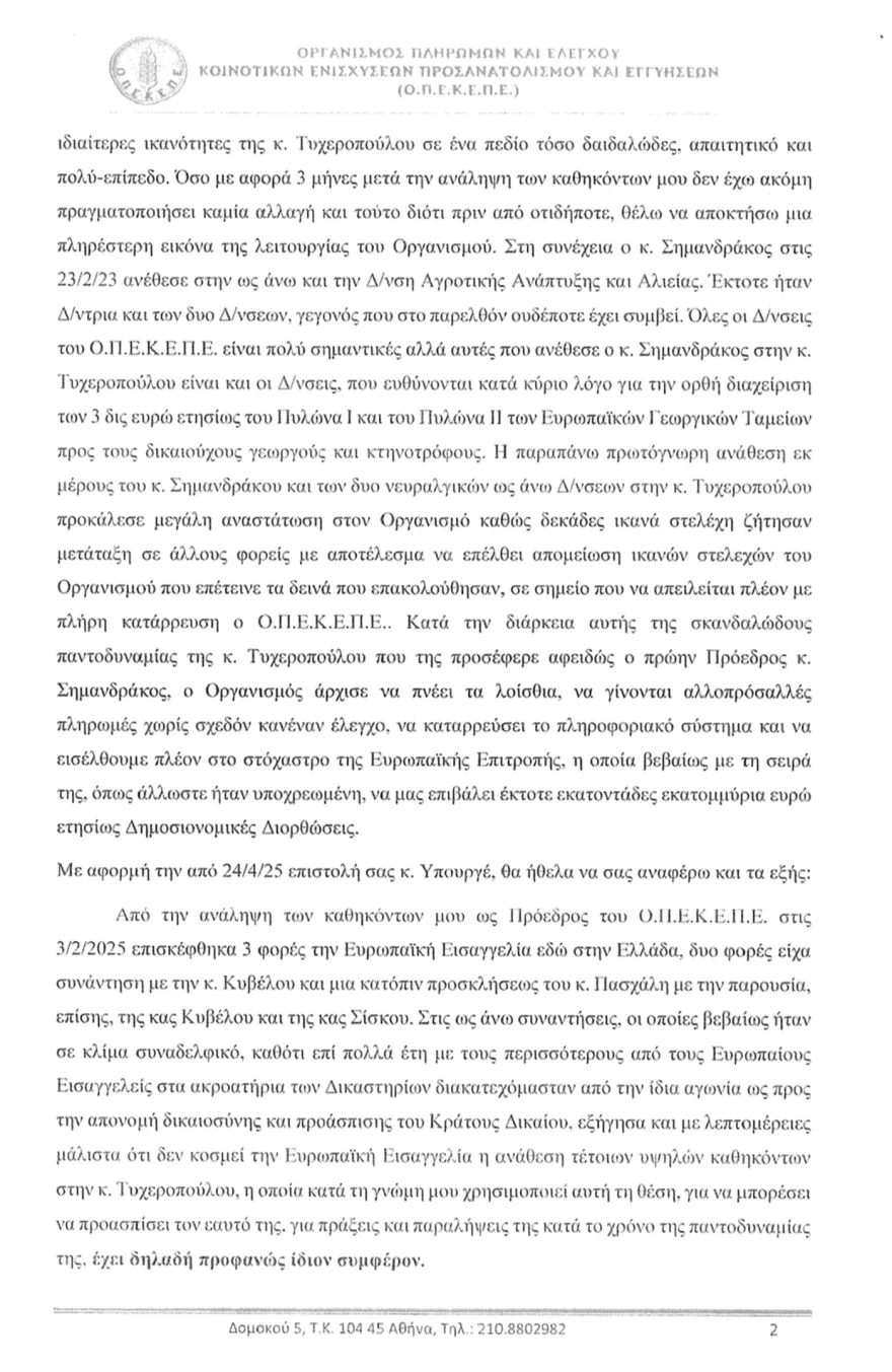 «Κατά τη διάρκεια αυτής της σκανδαλώδους παντοδυναμίας της κυρίας Τυχεροπούλου που της προσέφερε αφειδώς ο πρώην πρόεδρος κ. Σημανδράκος, ο Οργανισμός άρχισε να πνέει τα ολίσθια, να γίνονται αλλοπρόσαλλες πληρωμές χωρίς σχεδόν κανέναν έλεγχο, να καταρρεύσει το πληροφοριακό σύστημα και να εισέλθουμε πλέον στο στόχαστρο της Ευρωπαϊκής Επιτροπής, η οποία βεβαίως με την σειρά της, όπως άλλωστε ήταν υποχρεωμένη να μας επιβάλλει έκτοτε εκατοντάδες εκατομμύρια ευρώ ετησίως Δημοσιονομικές Διορθώσεις» σημειώνει στην επιστολή του για να προσθέσει αμέσως μετά πως για τα πεπραγμένα της κυρίαςς Τυχεροπούλου έχει ενημερώσει αναλυτικά τους ευρωπαίους εισαγγελείς σε 3 συναντήσεις.