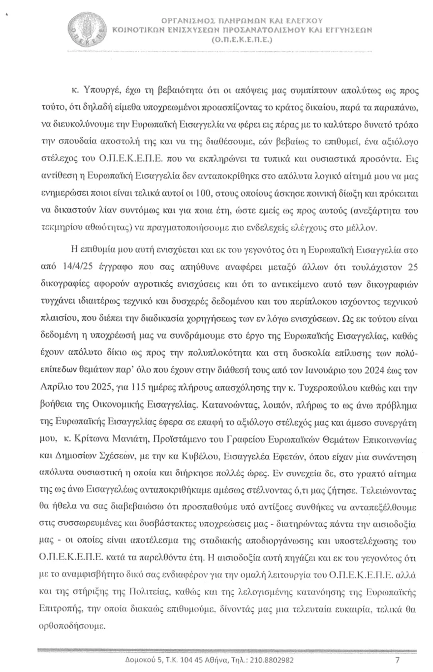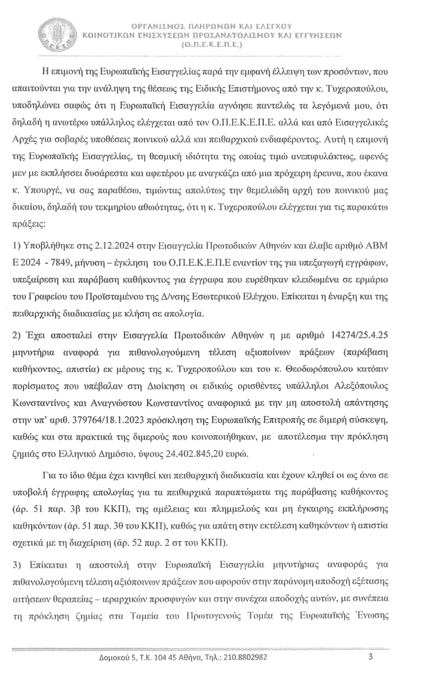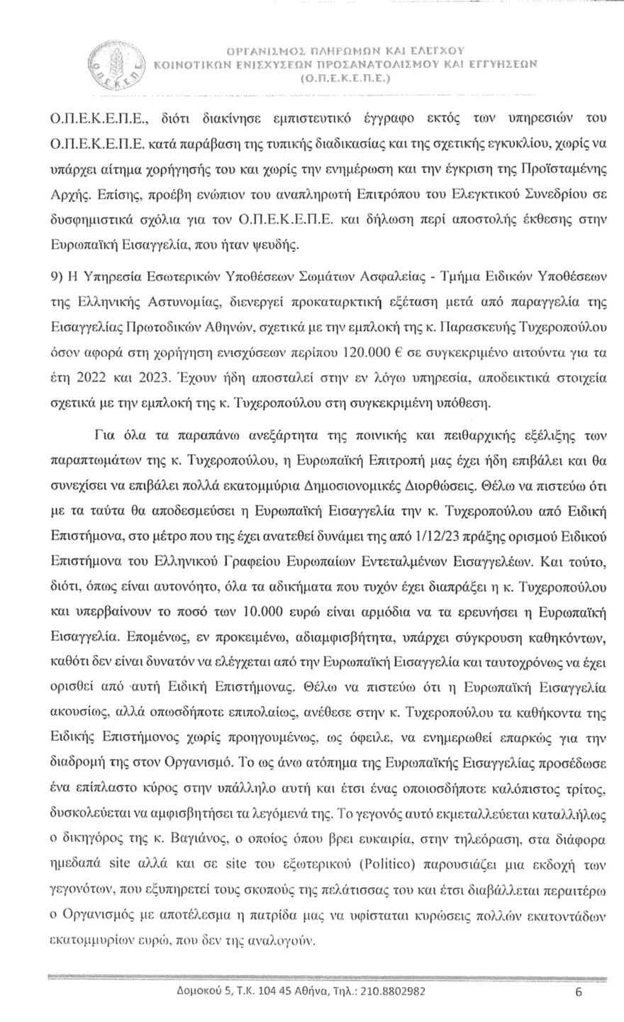 «Η επιμονή της Ευρωπαϊκής Εισαγγελίας παρά την εμφανή έλλειψη των προσόντων, που απαιτούνται και την ανάληψη της θέσεως της Ειδικής Επιστήμονος από την κυρία Τυχεροπούλου, υποδηλώνει σαφώς ότι η Ευρωπαϊκή Εισαγγελία αγνόησε παντελώς τα λεγόμενα μου, ότι δηλαδή η ανωτέρω υπάλληλος ελέγχεται από τον ΟΠΕΚΕΠΕ αλλά και απο Εισαγγελικές Αρχές για σοβαρές υποθέσεις ποινικού αλλά και πειθαρχικού ενδιαφέροντος. Αυτηή επιμονή της Ευρωπαϊκής Εισαγγελίας, τη θεσμική ιδιότητα της οποίας τιμώ ανεπιφυλάκτως, αφενός μεν με εκπλήσσει δυσάρεστα και αφετέρου με αναγκάζει από μια πρόχειρη έρευνα, που έκανα κ. Υπουργέ, να σας παραθέσω, τιμώντας απολύτως την θεμελιώδη αρχή του ποινικού μας δικαίου δηλαδή του τεκμηρίου της αθωότητας, ότι η κυρία Τυχεροπούλου ελέγχεται για τις παρακάτω πράξεις: