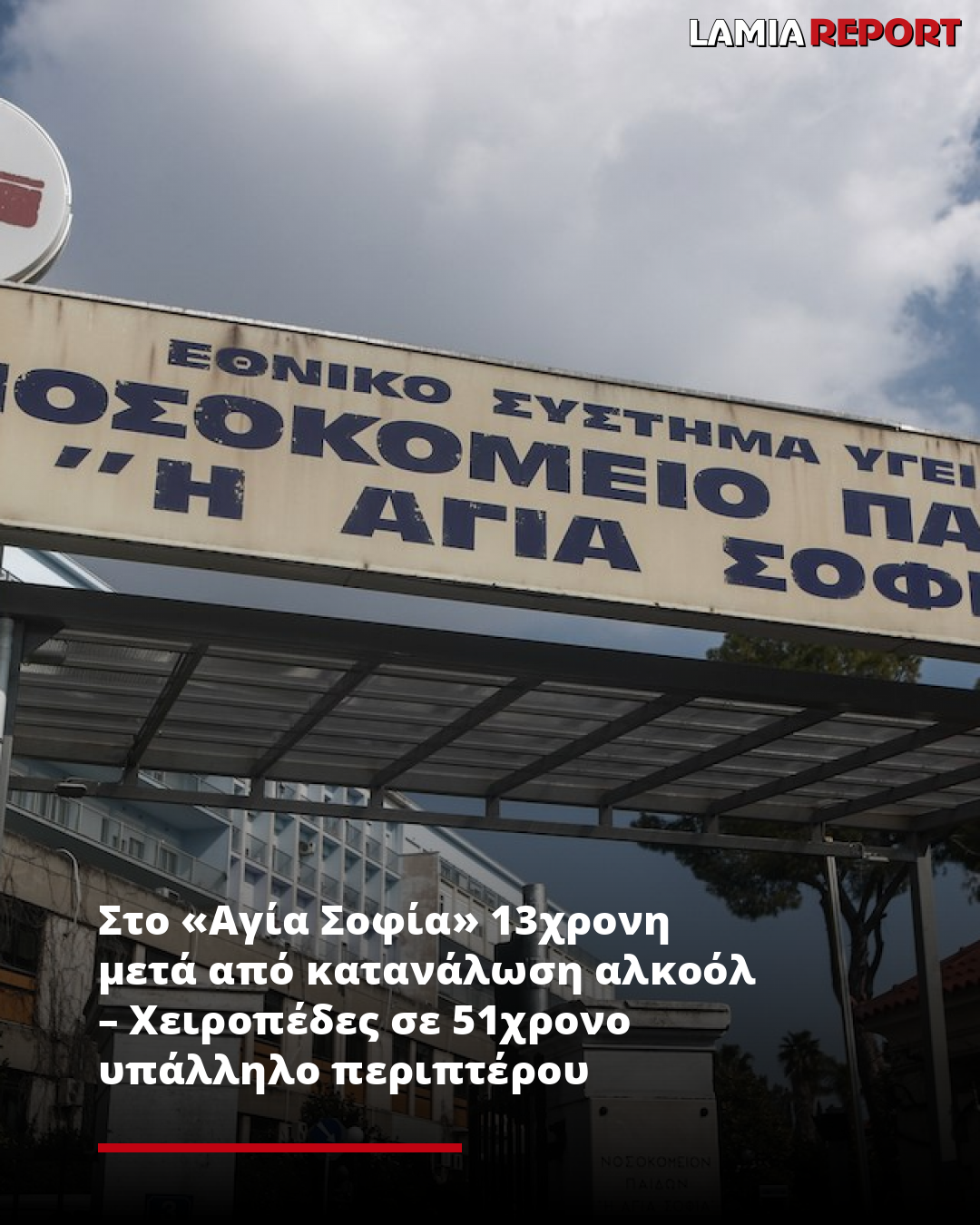 Μια 13χρονη μαθήτρια νοσηλεύεται εκτός κινδύνου στο νοσοκομείο Παίδων «Αγία Σοφία» μετά από κατανάλωση μεγάλης ποσότητας αλκοόλ που είχε ως αποτέλεσμα να λιποθυμήσει.