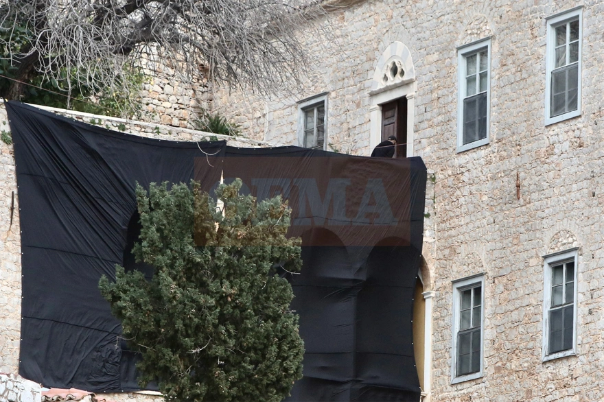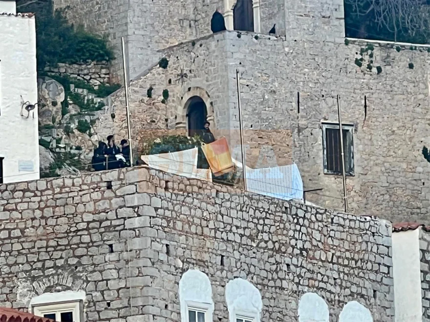 Στο πέτρινο συγκρότημα που δεσπόζει πάνω από το λιμάνι ξεχωρίζει ένα μεγάλο μαύρο ύφασμα, τοποθετημένο εξωτερικά και καλύπτοντας πλήρως τα παράθυρα συγκεκριμένου τμήματος του κτηρίου.