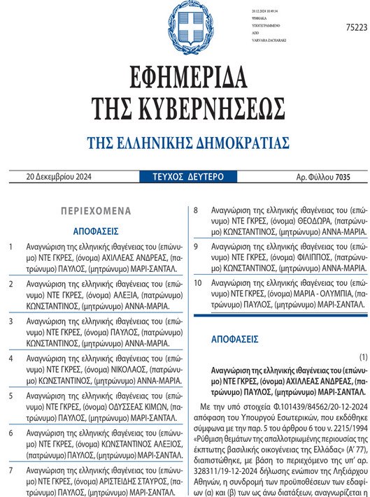 Ειδικότερα, η αναγνώριση της ελληνικής ιθαγένειας αφορά τους εξής: