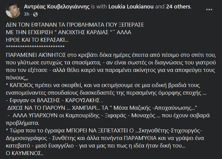 Στην ανάρτησή του ο Αντρέας Κεφαλογιάννης έγραψε: «Δεν τον έφταναν τα προβλήματα που πέρασε με την εγχείρηση ανοιχτής καρδιάς αλλά ήρθε και το κερασάκι.