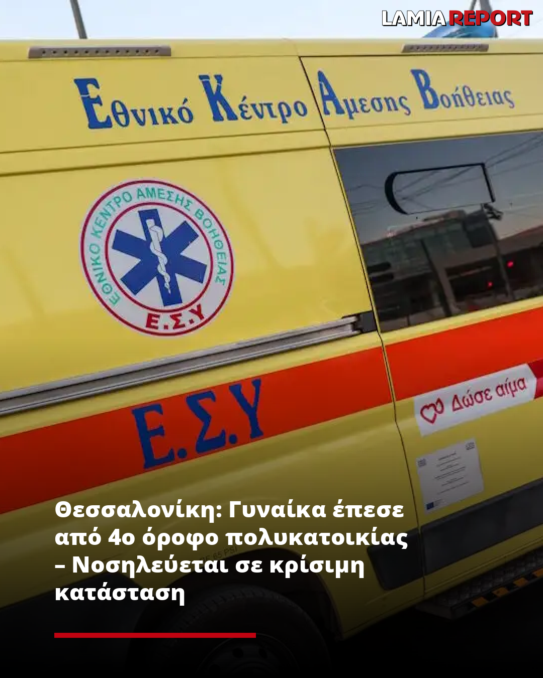 Η 61χρονη γυναίκα νοσηλεύεται σε κρίσιμη κατάσταση νοσηλεύεται όταν κάτω από αδιευκρίνιστες μέχρι στιγμής συνθήκες το μεσημέρι της Παρασκευής (06.02.2026) έπεσε από τον τέταρτο όροφο πολυκατοικίας στα Διαβατά Θεσσαλονίκης.