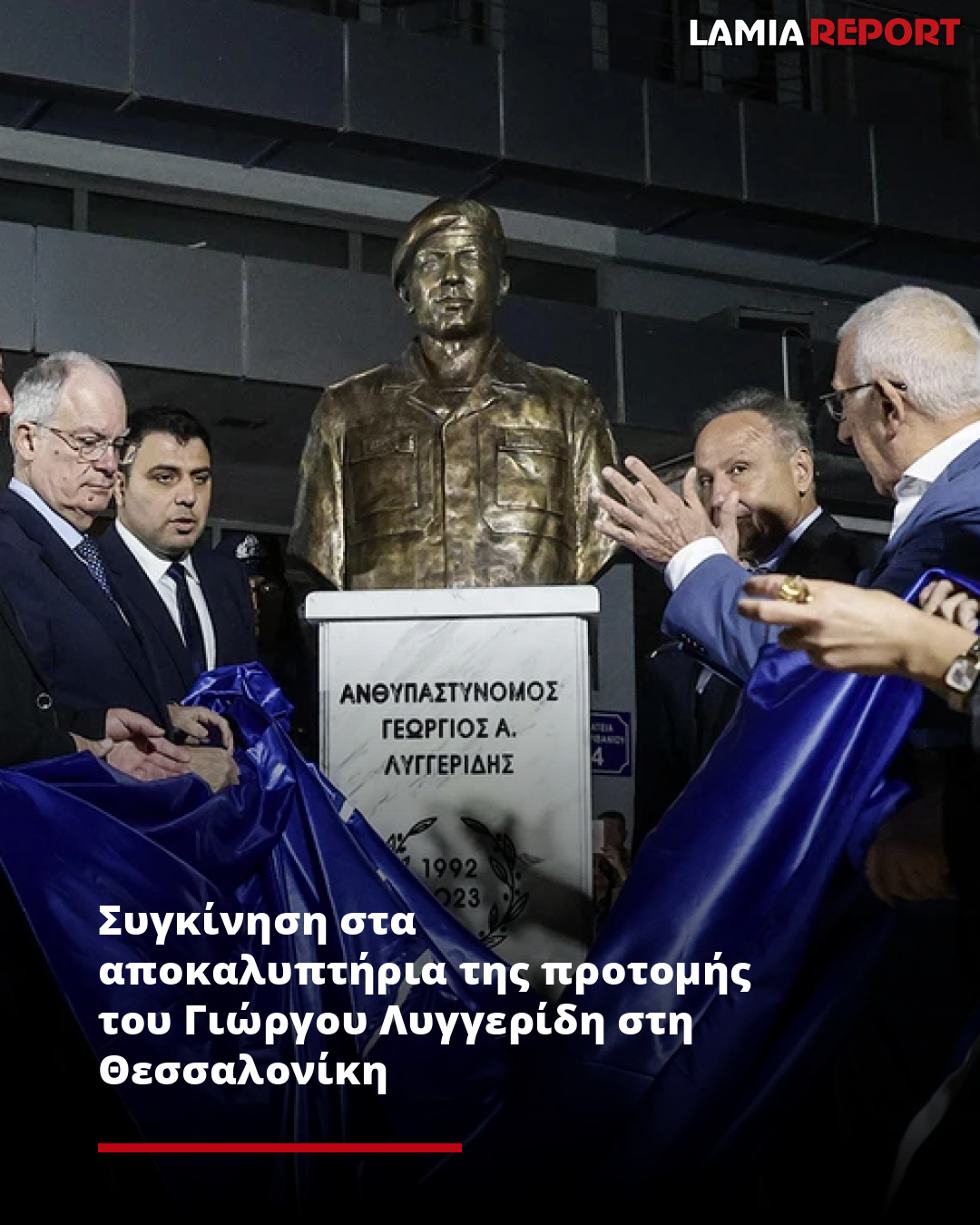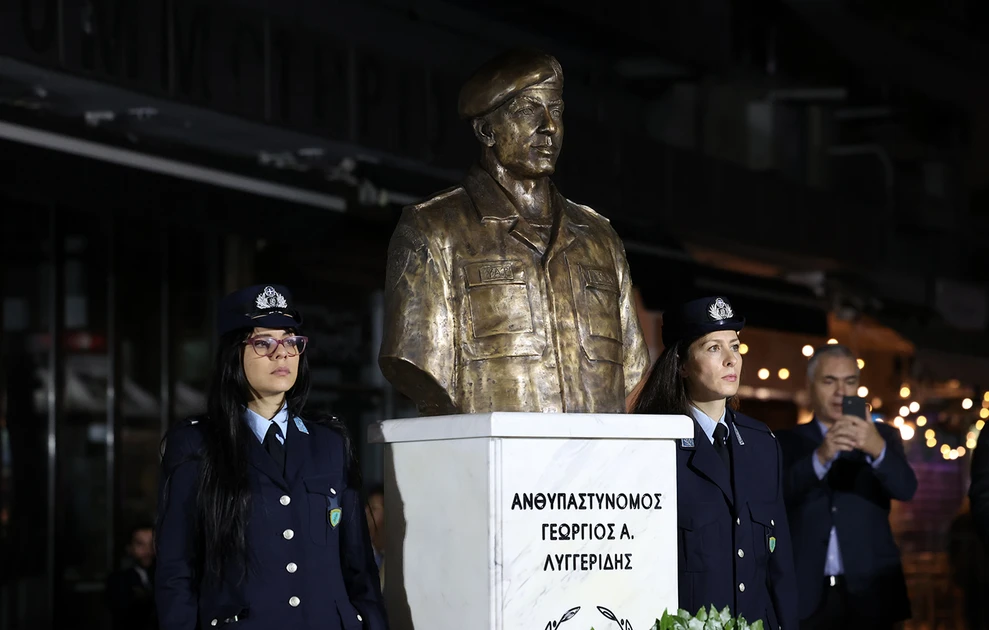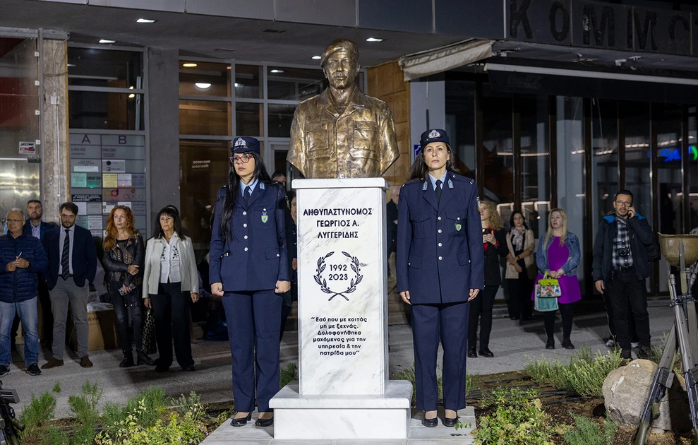 Τα αποκαλυπτήρια της προτομής του Γεωργίου Λυγγερίδη, του αστυνομικού των ΜΑΤ που έπεσε νεκρός, ύστερα από επίθεση χούλιγκαν στου Ρέντη, το Δεκέμβριο του 2023, έγιναν το απόγευμα στη Θεσσαλονίκη.