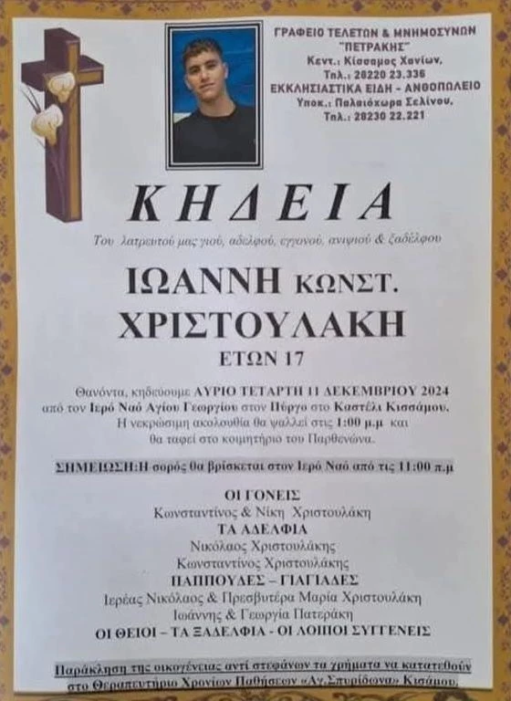 Η κηδεία του 17χρονου Γιάννη θα πραγματοποιηθεί την Τετάρτη 11 Δεκεμβρίου στον Ιερό Ναό Αγίου Γεωργίου στον πύργο Καστελίου. Η σορός θα βρίσκεται στον ναό από τις 11:00 το πρωί.