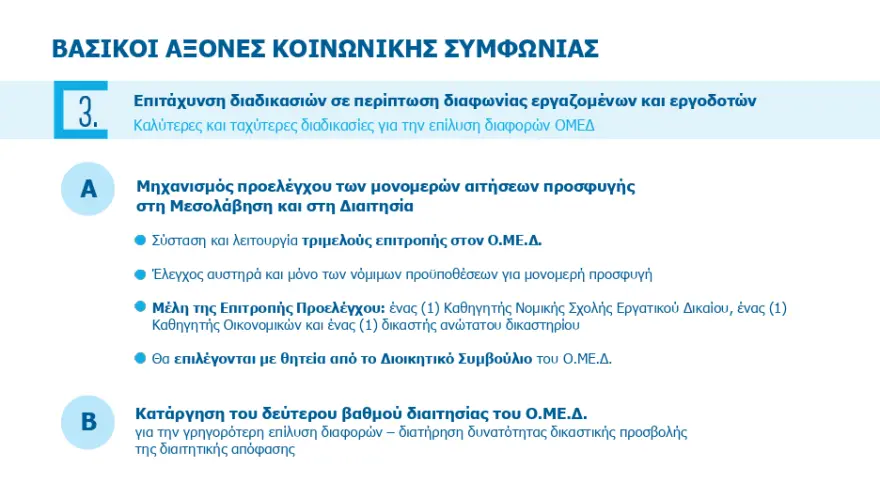 Στον τρίτο άξονα που αφορά στην επιτάχυνση των διαδικασιών σε περίπτωση διαφωνίας εργαζομένων και εργοδοτών. Θεσπίζονται καλύτερες και ταχύτερες διαδικασίες για την επίλυση διαφορών μέσω του Ο.ΜΕ.Δ.