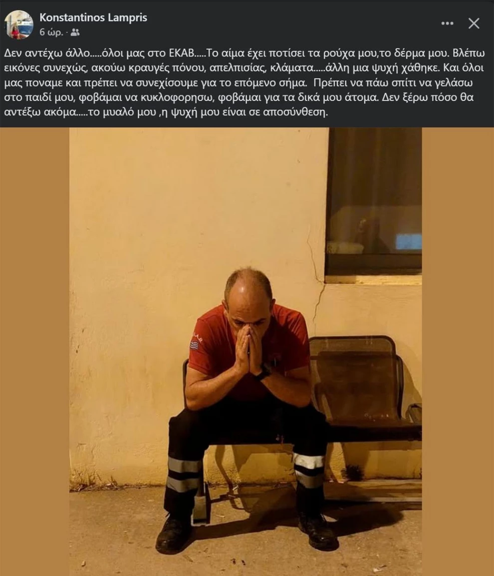 «Δεν αντέχω άλλο… όλοι μας στο ΕΚΑΒ… το αίμα έχει ποτίσει τα ρούχα μου, το δέρμα μου, βλέπω εικόνες συνεχώς, ακούω κραυγές πόνου, απελπισίας, κλάματα… άλλη μια ψυχή χάθηκε. Και όλοι μας πονάμε και πρέπει να συνεχίσουμε για το επόμενο σήμα. Πρέπει να πάω σπίτι να γελάσω στο παιδί μου, φοβάμαι να κυκλοφορήσω, φοβάμαι για τα δικά μου άτομα. Δεν ξέρω πόσο θα αντέξω ακόμα… το μυαλό μου, η ψυχή μου είναι σε αποσύνθεση» γράφει ο κ. Λάμπρης.