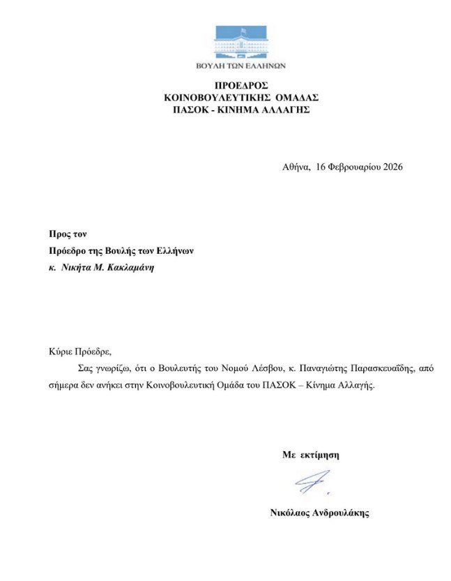 Με επιστολή του στον πρόεδρο της Βουλής, ο Νίκος Ανδρουλάκης γνωστοποίησε ότι ο βουλευτής Λέσβου Παναγιώτης Παρασκευαΐδης τίθεται, σύμφωνα με το iefimerida.gr, εκτός της Κοινοβουλευτικής Ομάδας του ΠΑΣΟΚ-Κινήματος Αλλαγής.