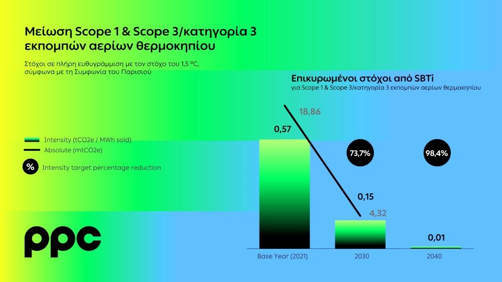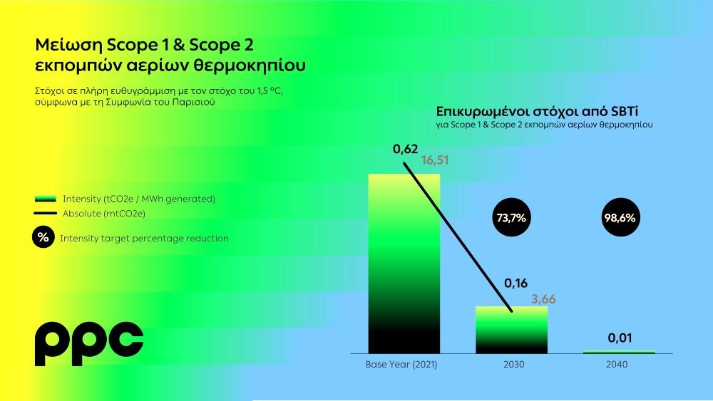 - Μείωση 98,6% των Scope 1 και 2 εκπομπών αερίων θερμοκηπίου ανά παραγόμενη MWh έως το 2040,με έτος βάσης το 2021