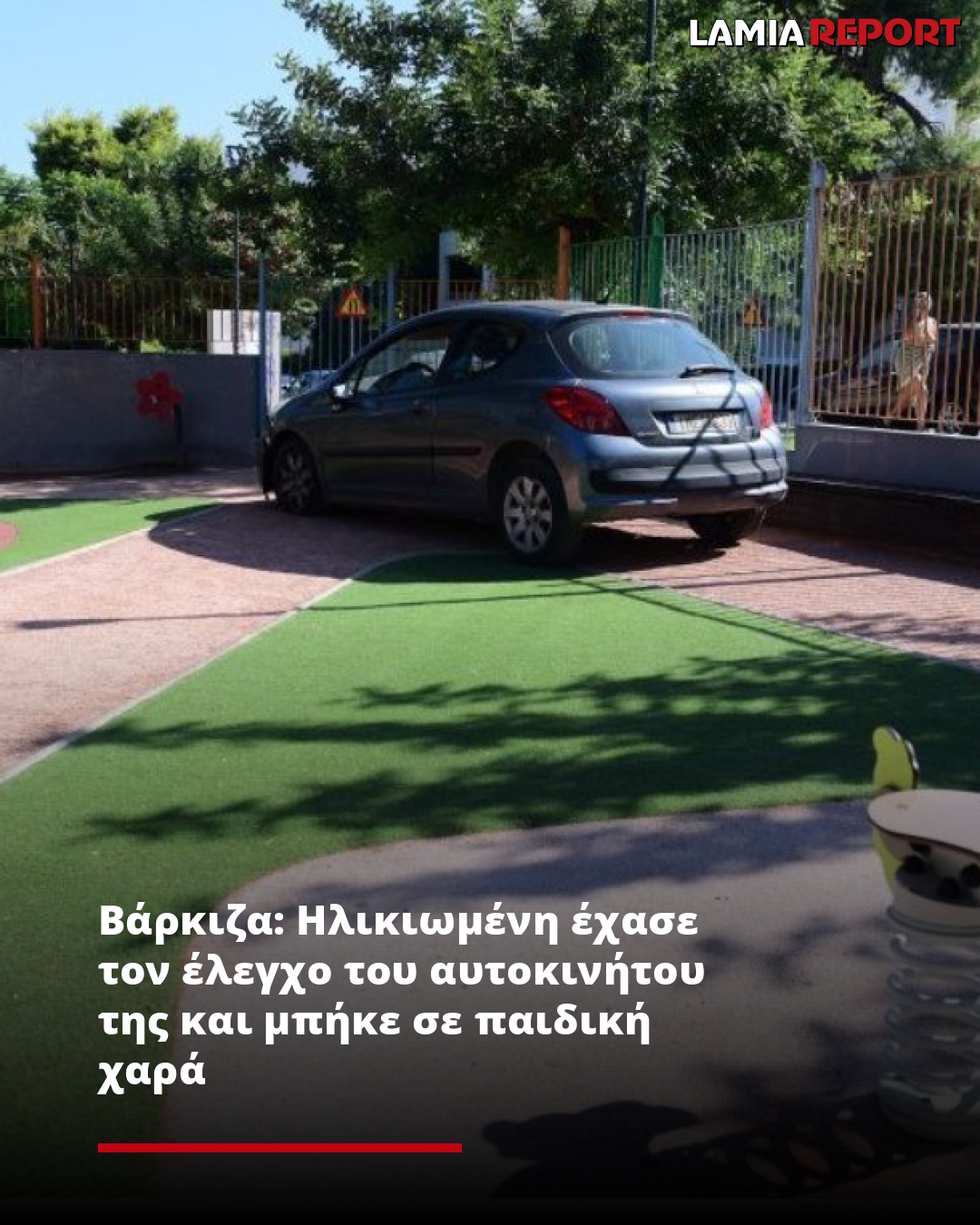 Σύμφωνα με πληροφορίες η ηλικιωμένη γυναίκα έχασε τον έλεγχο του αυτοκινήτου της, έσπασε τα κάγκελα της παιδικής χαράς και μπήκε μέσα.