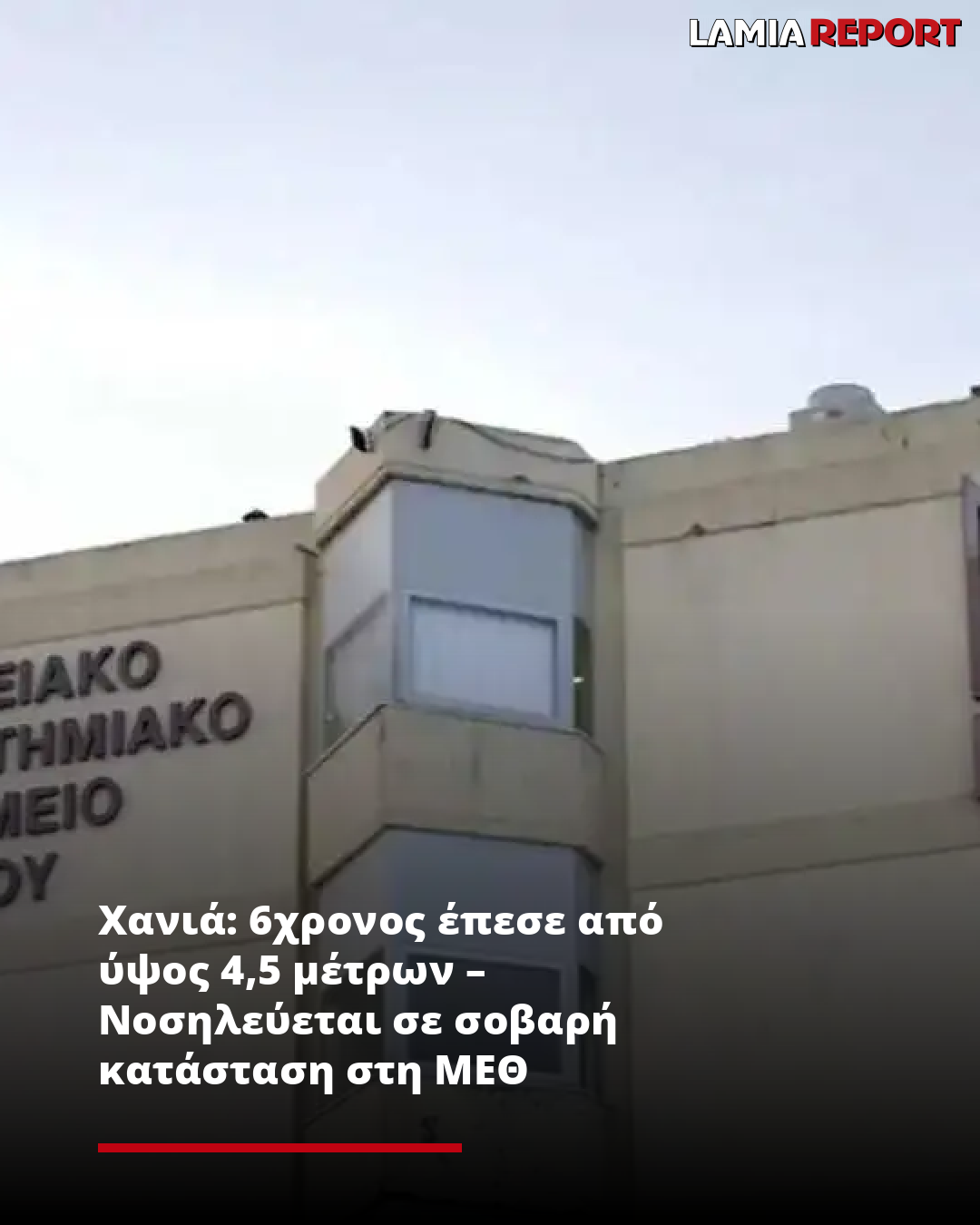 Σε σοβαρή κατάσταση νοσηλεύεται στη ΜΕΘ Παίδων του ΠΑΓΝΗ ένα αγόρι 6 ετών μετά από πτώση από ύψος 4,5 μέτρων στα Χανιά, το απόγευμα της Παρασκευής (11.4.25).
