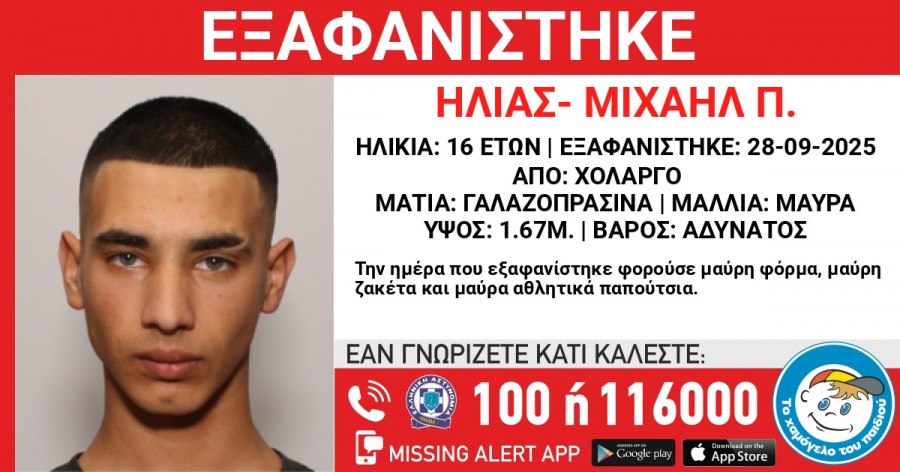 Στις 29/09/2025, βραδινές ώρες, εξαφανίστηκε από την περιοχή του Χολαργού ο Ηλίας- Μιχαήλ Π., 16 ετών.