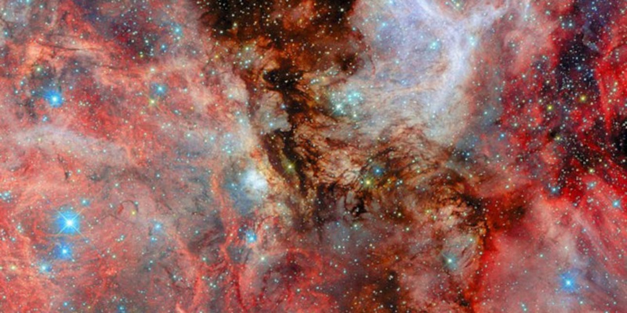 Πυκνά νέφη ψυχρού υδρογόνου, το βασικό «καύσιμο» για τη δημιουργία άστρων, διασχίζουν την περιοχή, φωτιζόμενα με βαθύ κόκκινο χρώμα στα σημεία όπου γεννιούνται νεαρά άστρα.