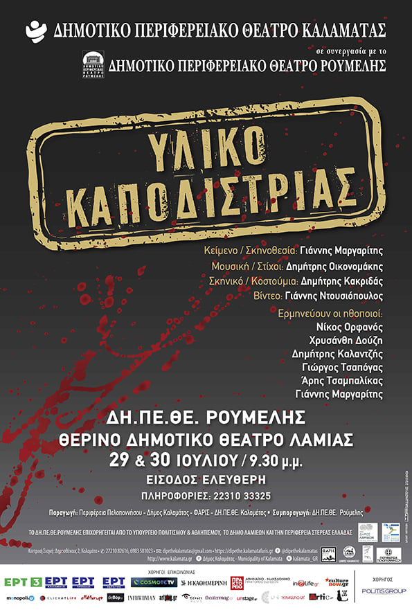 Το Δημοτικό Περιφερειακό Θέατρο Καλαμάτας σε συμπαραγωγή με το Δημοτικό Περιφερειακό Θέατρο Ρούμελης, μετά από παραγγελία της Περιφέρειας Πελοποννήσου για τον εορτασμό των 200 Χρόνων από την Επανάσταση του 1821, αυτό το καλοκαίρι παρουσιάζει σε περιοδεία, σε περισσότερους από 25 σταθμούς σε όλη την Ελλάδα, την παράσταση "Υλικό Καποδίστριας", μια θεατρική σύνθεση του Γιάννη Μαργαρίτη, σε σκηνοθεσία του ιδίου. Η παράσταση διερευνά με σύγχρονο και απόλυτα θεατρικό τρόπο την άγνωστη σε πολλούς προσωπικότητα του πρώτου κυβερνήτη του ελληνικού κράτους, τον οποίο ο λαός αγάπησε σαν πατέρα, την επίδραση της προσωπικότητας και του έργου του σε όλη την Ευρώπη, τον μεγάλο του έρωτα με την Ρωξάντρα Στούρτζα, αλλά και τις πολιτικές του παρακαταθήκες.