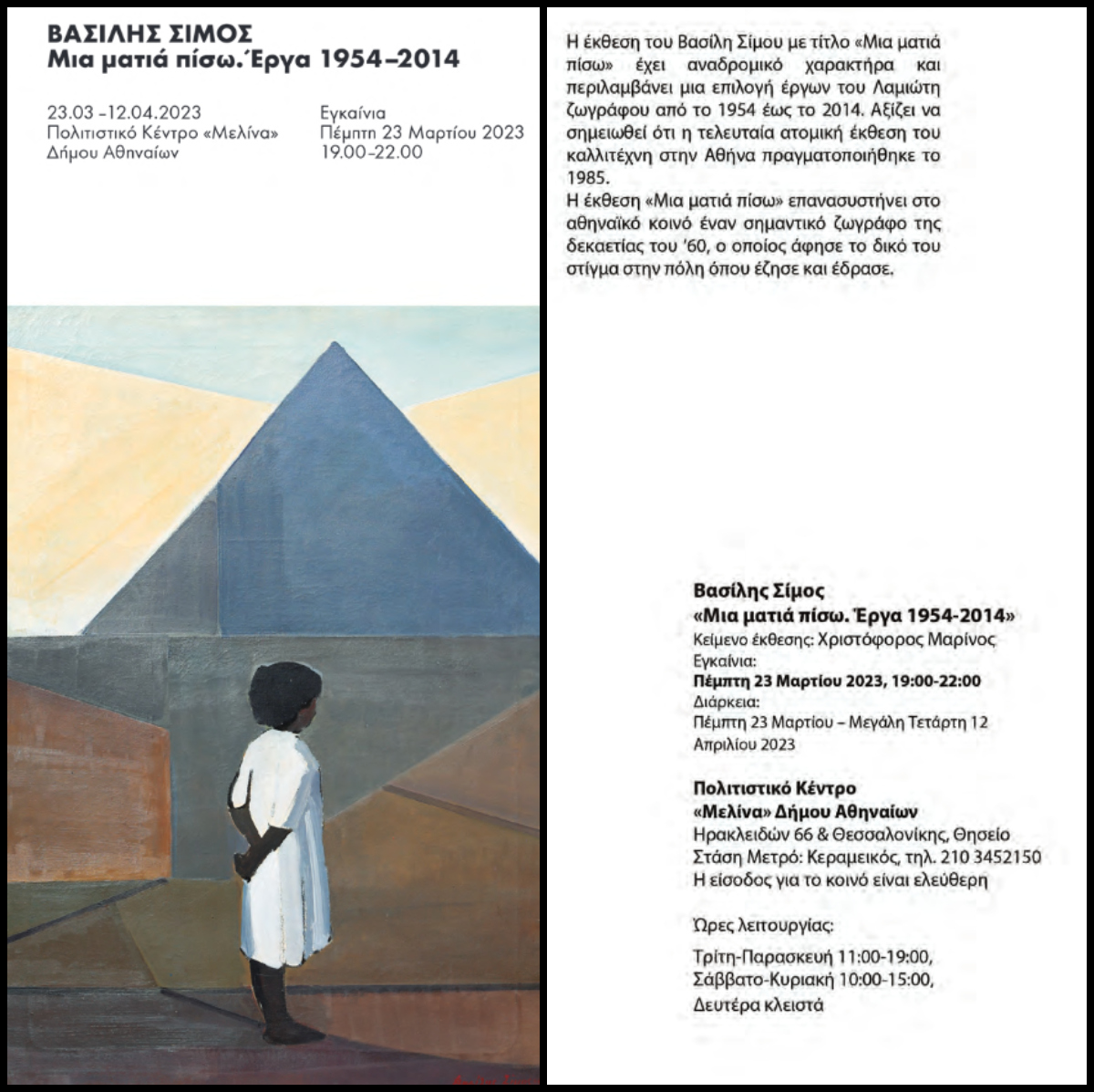 Η έκθεση του Βασίλη Σίμου με τίτλο «Μια ματιά πίσω» έχει αναδρομικό χαρακτήρα και περιλαμβάνει μια επιλογή έργων του Λαμιώτη ζωγράφου από το 1954 έως το 2014.