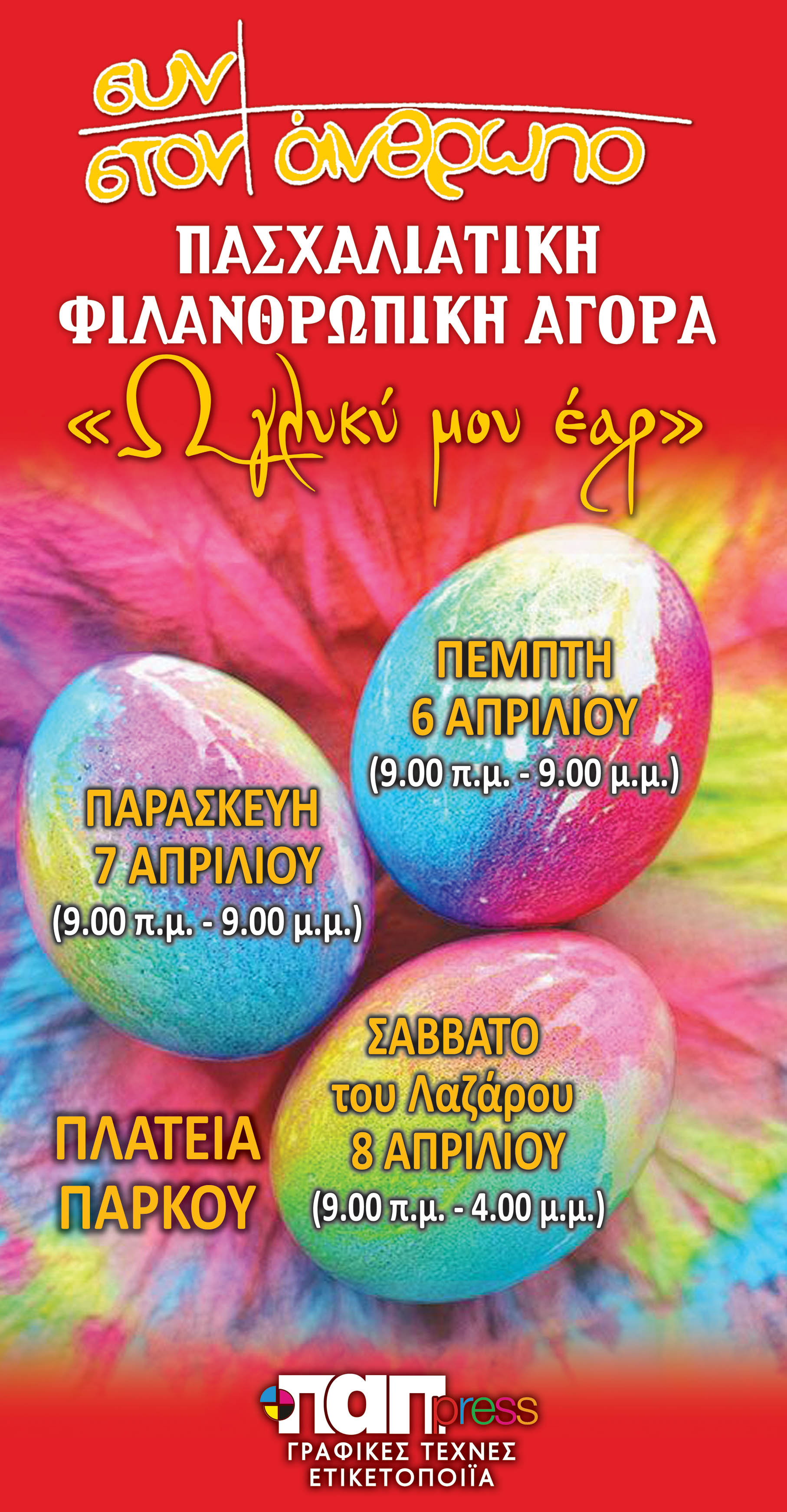 Συνεπείς και φέτος στο Πασχαλιάτικο ραντεβού μας, στη γιορτή της προσφοράς και της αλληλεγγύης, με ευγνωμοσύνη σας περιμένουμε στην αγορά μας «Ω ΓΛΥΚΥ ΜΟΥ ΕΑΡ» στην Πλατεία Πάρκου της πόλης μας τις παρακάτω ημερομηνίες: