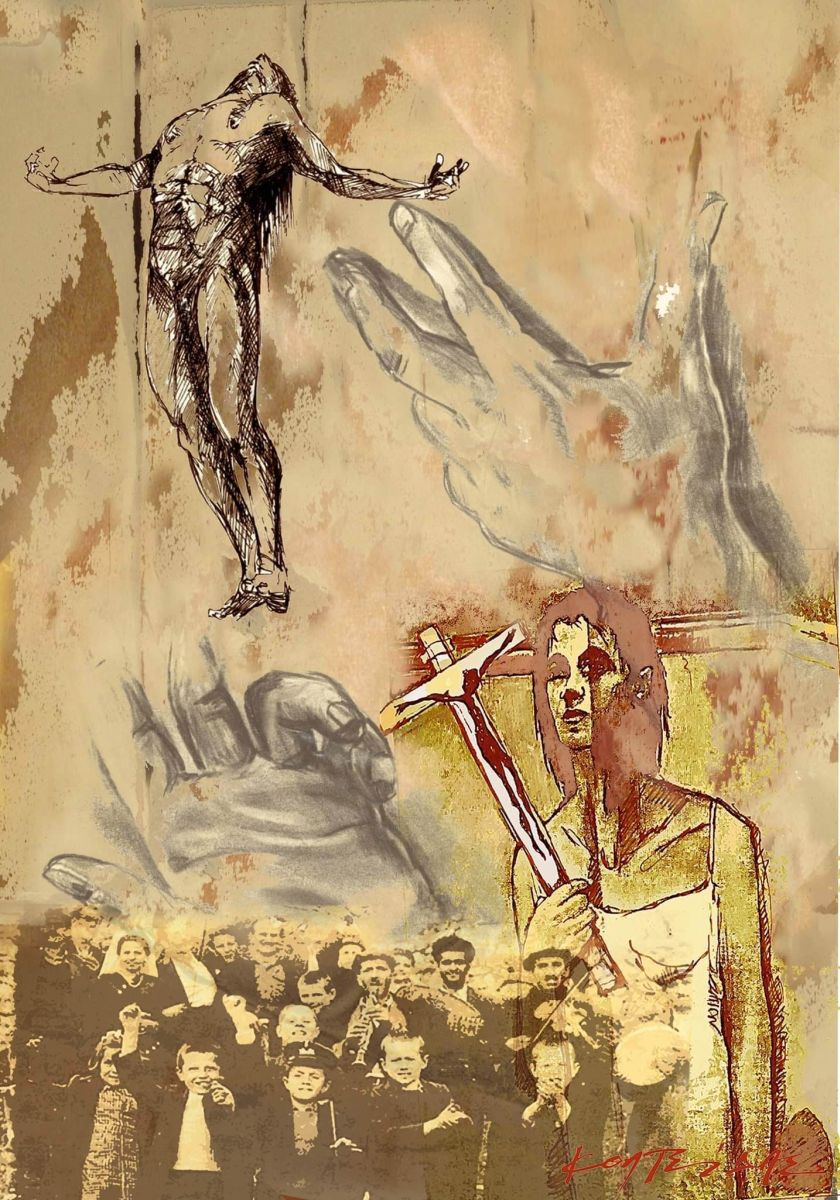 Μέσα από την χρήση της εικονικής αναπαράστασης του απόλυτου θρησκευτικού συμβόλου της θυσίας, τον Ιησού, επιτυγχάνει την σύνδεση σε κοινωνικό και πολιτικό επίπεδο με σύγχρονες μορφές «θυσίας», όπως είναι η θέση της γυναίκας και τα φαινόμενα των γυναικοκτονιών του σήμερα κ.α.