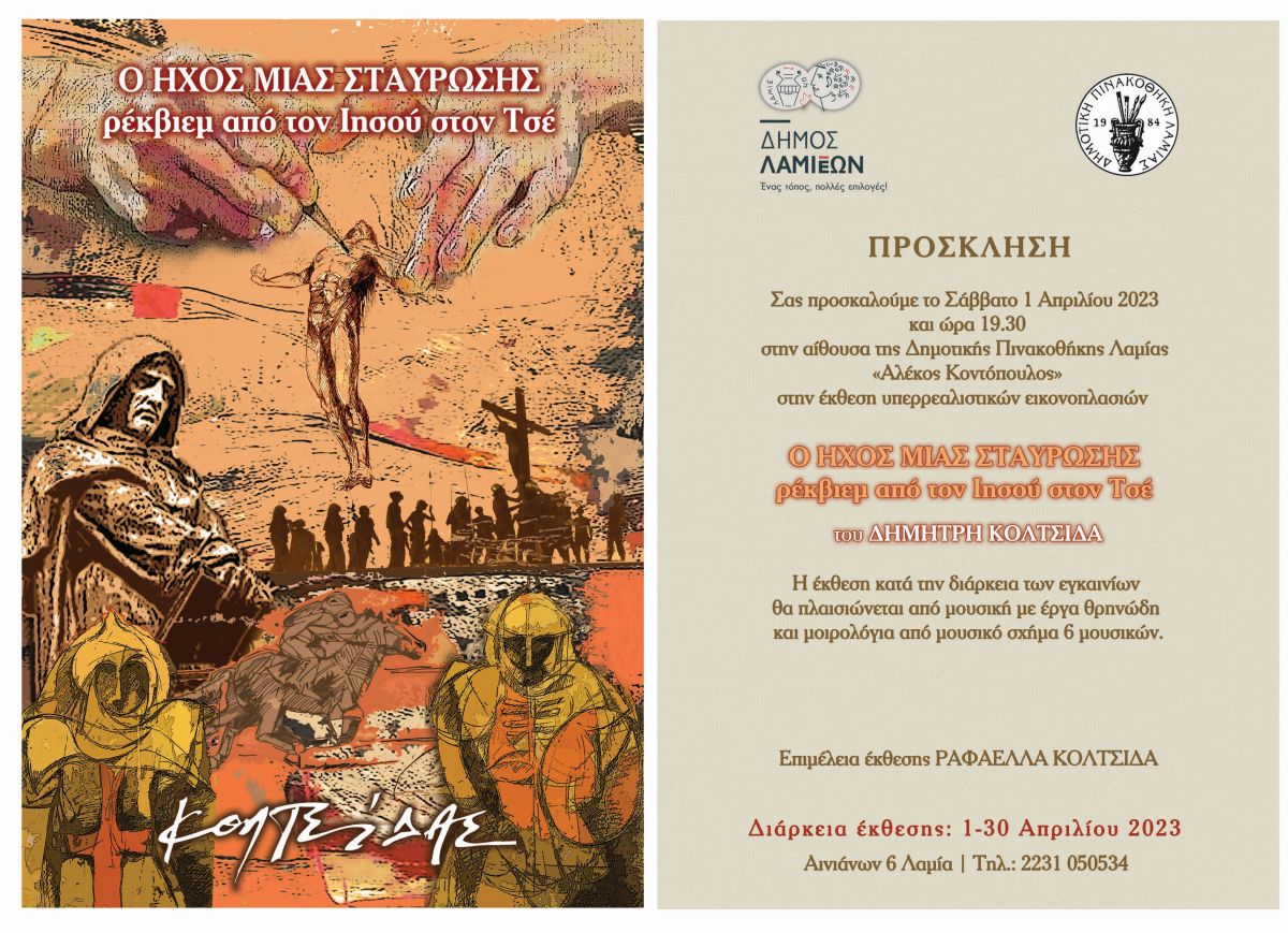 Ο Δήμος Λαμιέων σας προσκαλεί στα εγκαίνια της εικαστικής έκθεσης του Δημήτρη Κολτσίδα, με τίτλο «Ο ΗΧΟΣ ΜΙΑΣ ΣΤΑΥΡΩΣΗΣ ρέκβιεμ από τον Ιησού στον Τσέ», το Σάββατο 1 Απριλίου 2023 και ώρα 19:30, στη Δημοτική Πινακοθήκη Λαμίας «Αλέκος Κοντόπουλος», Αινιάνων 6.