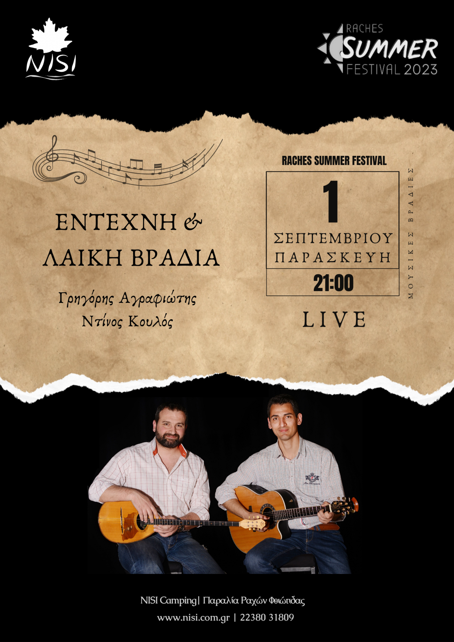 Ο Γρηγόρης Αγραφιώτης στην κιθάρα και ο Ντίνος Κουλός στο μπουζούκι ξανά μαζί μας στο NISI, την Παρασκευή 1 Σεπτεμβρίου, να μας ξεναγήσουν στα μονοπάτια της έντεχνης και λαϊκής μουσικής.