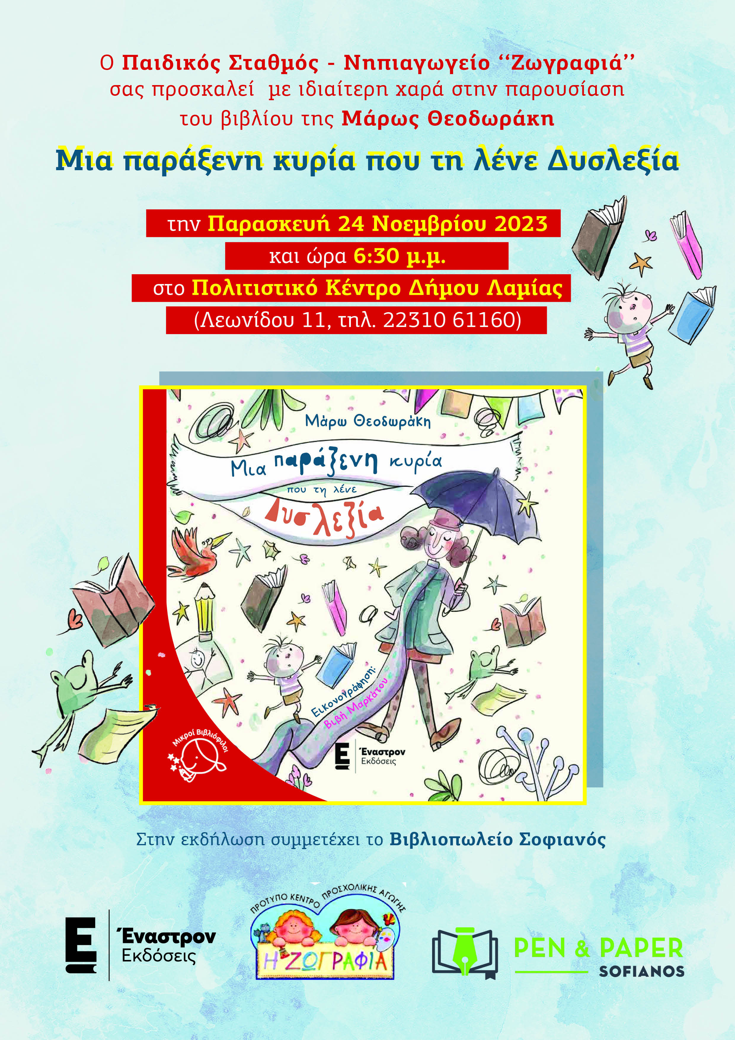 Ο Παιδικός σταθμός - Νηπιαγωγείο «Ζωγραφιά», σας προσκαλεί με ιδιαίτερη χαρά στην παρουσίαση του βιβλίου της Μάρως Θεοδωράκη, με τίτλο: «Μια παράξενη κυρία που τη λένε δυσλεξία», την Παρασκευή 24 Νοεμβρίου, στις 18:30, στο Πολιτιστικό Κέντρο Λαμίας (Λεωνίδου 11 - τηλέφωνο επικοινωνίας: 2231061160).