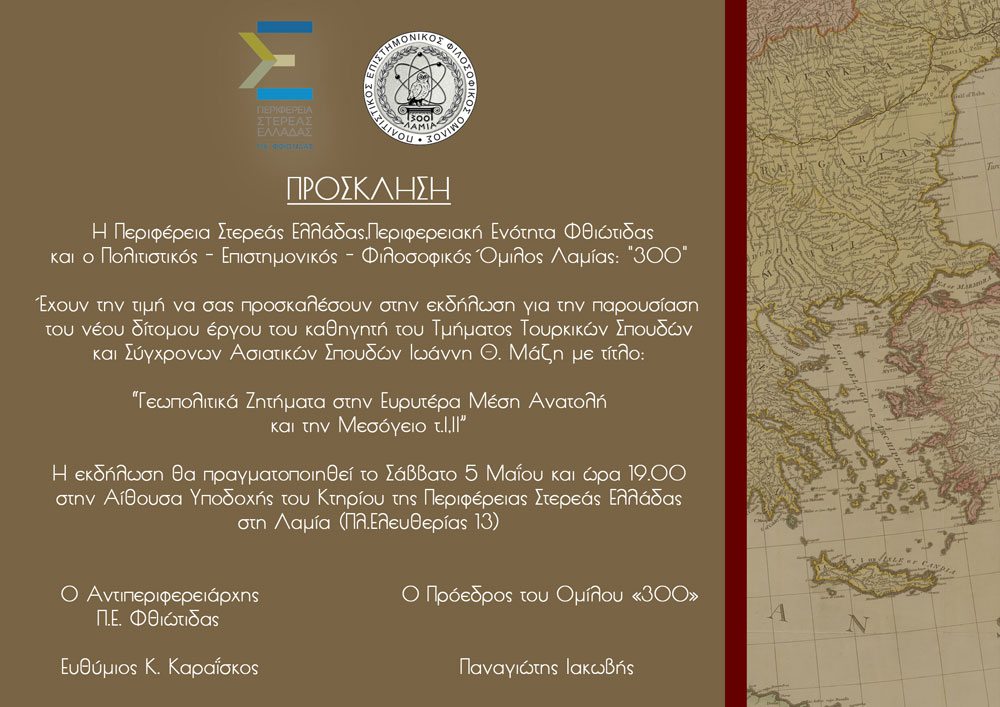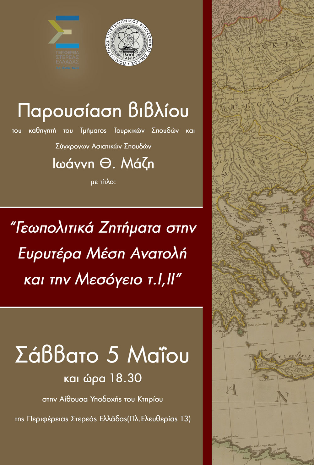 Ο γνωστός Καθηγητής Τουρκικών Σπουδών και Σύγχρονων Ασιατικών Σπουδών, Ιωάννης Θ. Μάζης θα βρεθεί το Σάββατο 5 Μαΐου 2018 στη Λαμία, προκειμένου να παρουσιάσει το νέο δίτομο έργο του «Γεωπολιτικά Ζητήματα στην Ευρυτέρα Μέση Ανατολή και τη Μεσόγειο τ. Ι,ΙΙ».