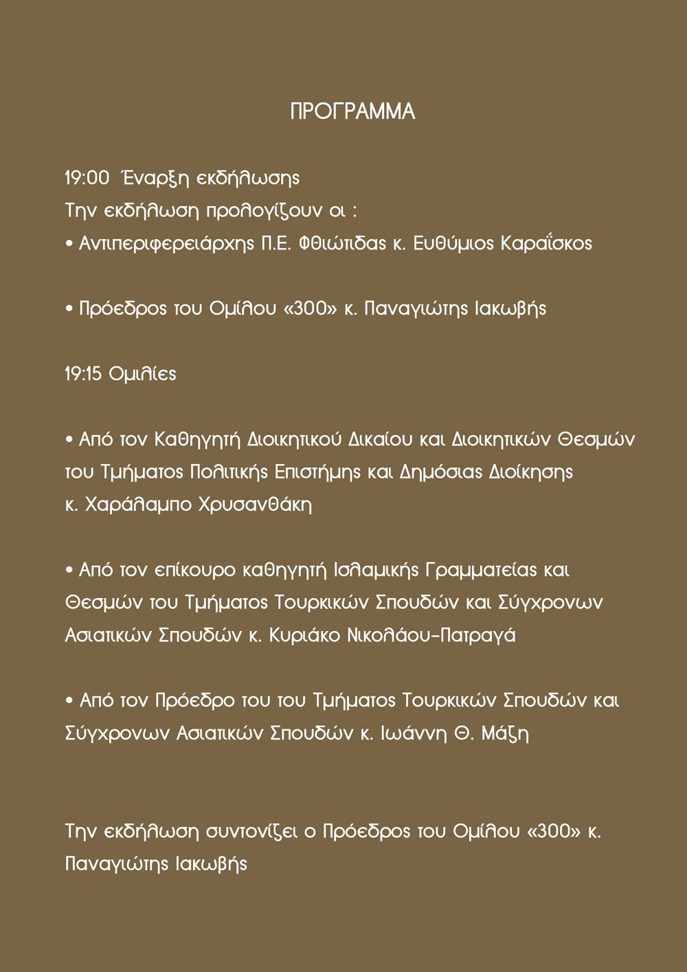 Την εκδήλωση συνδιοργανώνουν η Περιφέρεια Στερεάς Ελλάδας και ο Πολιτιστικός - Επιστημονικός - Φιλοσοφικός Όμιλος Λαμίας «300».
