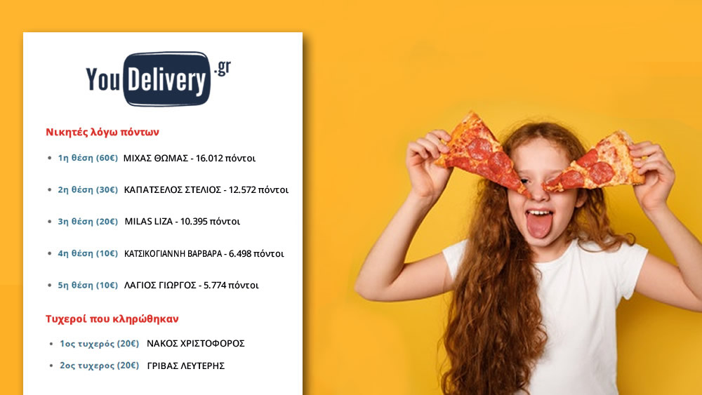 Κάθε μήνα αναδεικνύονται, χωρίς κλήρωση, πέντε νικητές που κερδίζουν κουπόνια δωρεάν Delivery. Πρόκειται για τους πέντε πρώτους σε πόντους μήνα, και όπως μπορείτε να δείτε στo blog του YouDelivery... δεν είναι λίγοι αυτοί που "έχουν πιάσει το νόημα"! Καταφέρνοντας ξανά και ξανά να σκαρφαλώνουν στις πρώτες θέσεις της μηνιαίας λίστας πόντων (η λίστα διατίθεται Live στο YouDelivery).