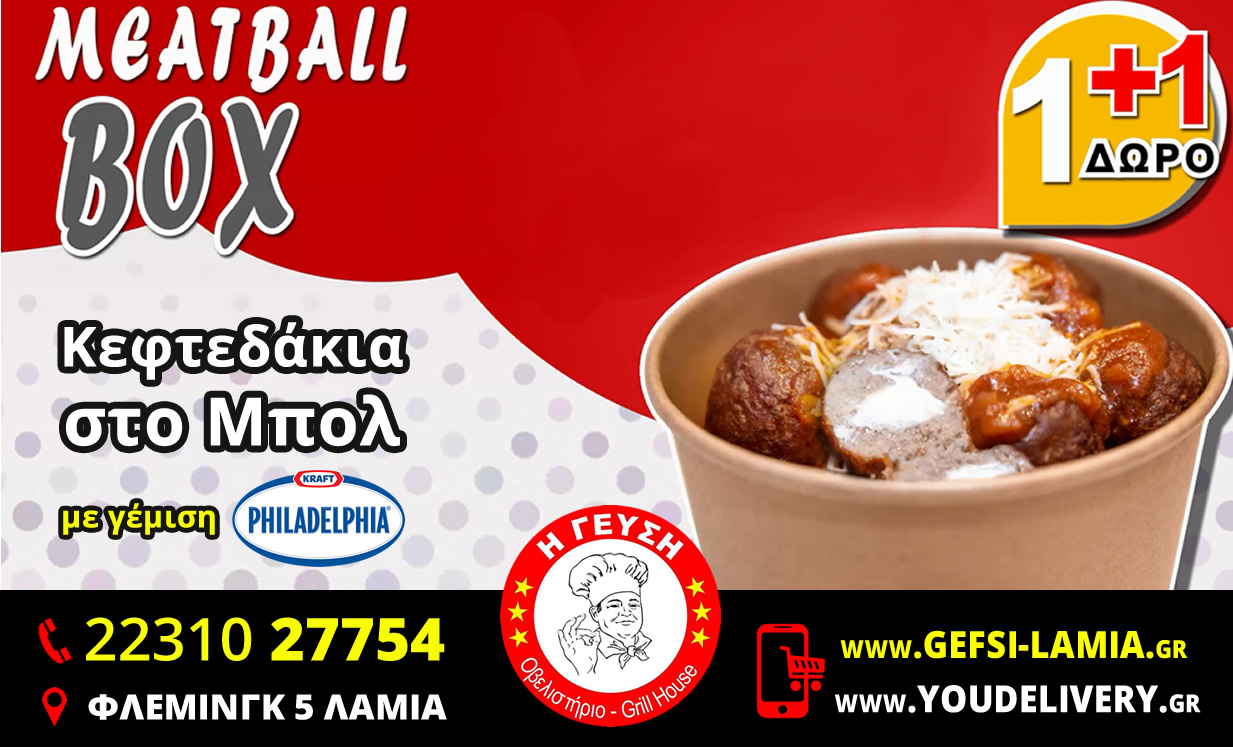 Το σουβλατζίδικο της πόλης που... ξέρει από Γεύση μας συστίνει νέα πρόταση που ακούει στο όνομα Meatball Box και σε καλεί να τη δοκιμάσεις σε προσφορά1+1 ΔΩΡΟ.
