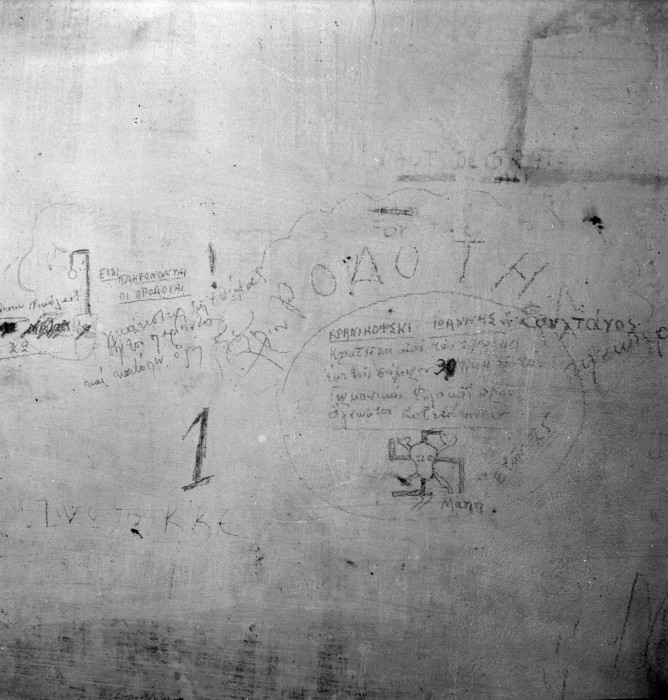 (Βούλα Παπαϊωάννου, Σημειώματα κρατουμένων στον τοίχο του γερμανικού κρατητηρίου της οδού Μέρλιν, Αθήνα, 1944 © Μουσείο Μπενάκη / Φωτογραφικά Αρχεία)