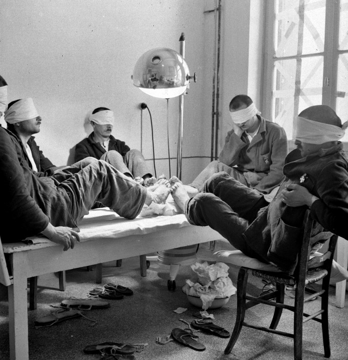 (Βούλα Παπαϊωάννου, Θεραπεία κρυοπαγημάτων σε νοσοκομείο του Ελληνικού Ερυθρού Σταυρού, Αθήνα, Απόκριες 1941© Μουσείο Μπενάκη / Φωτογραφικά Αρχεία)