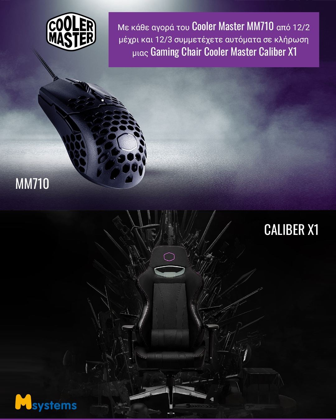 Αγοράζοντας από τοMsystems.gr τοCooler Master MasterMouse MM710, το ελαφρύτερο ποντίκι της αγοράς, μπαίνειςαυτόματα στην κλήρωση για να κερδίσειςμια GamingChair Cooler MasterCaliber X1.